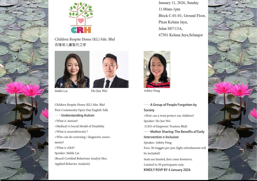 为增进社会对自闭症的认识探讨特殊儿童的长远照护支持,吉隆坡儿童暂托之家(Children Respite Home )将于1月11日(星期日)上午11时至下午1时在格拉若再也會所举办首届社区开放日,以“认识自闭症”为主题举办专场英语讲座。活动邀请三位来自不同领域的讲者,从行为科学、财务规划及亲身经历等多角度,为特殊儿童家庭提供实用资讯与正能量支持。