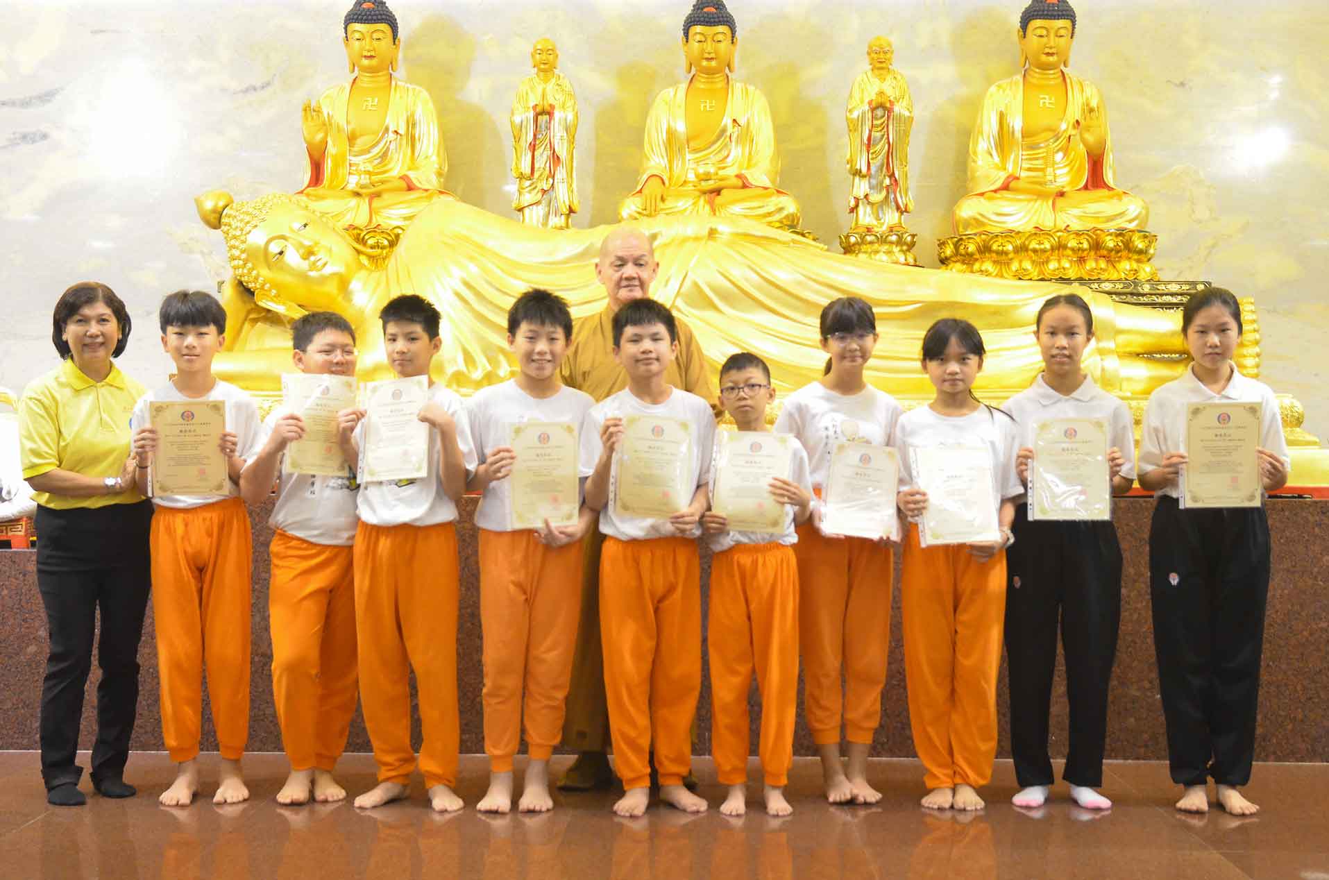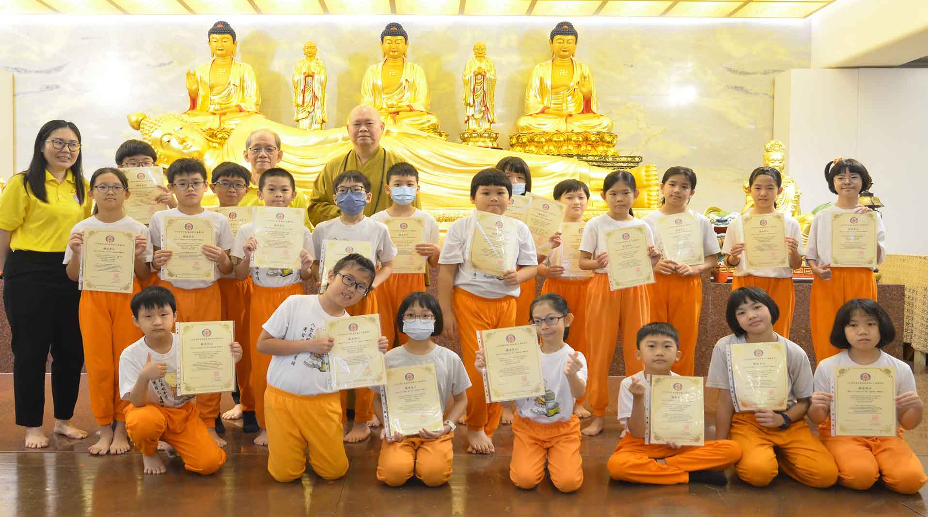 周日儿童佛学班休业与结业典礼的仪式包括颁发12A“毕业证书”、全年各级认真学习、行为良好及高出席率的同学获颁予“精进”奖状,另外,今年增设“全勤奖”予全年准时无缺席的学生。