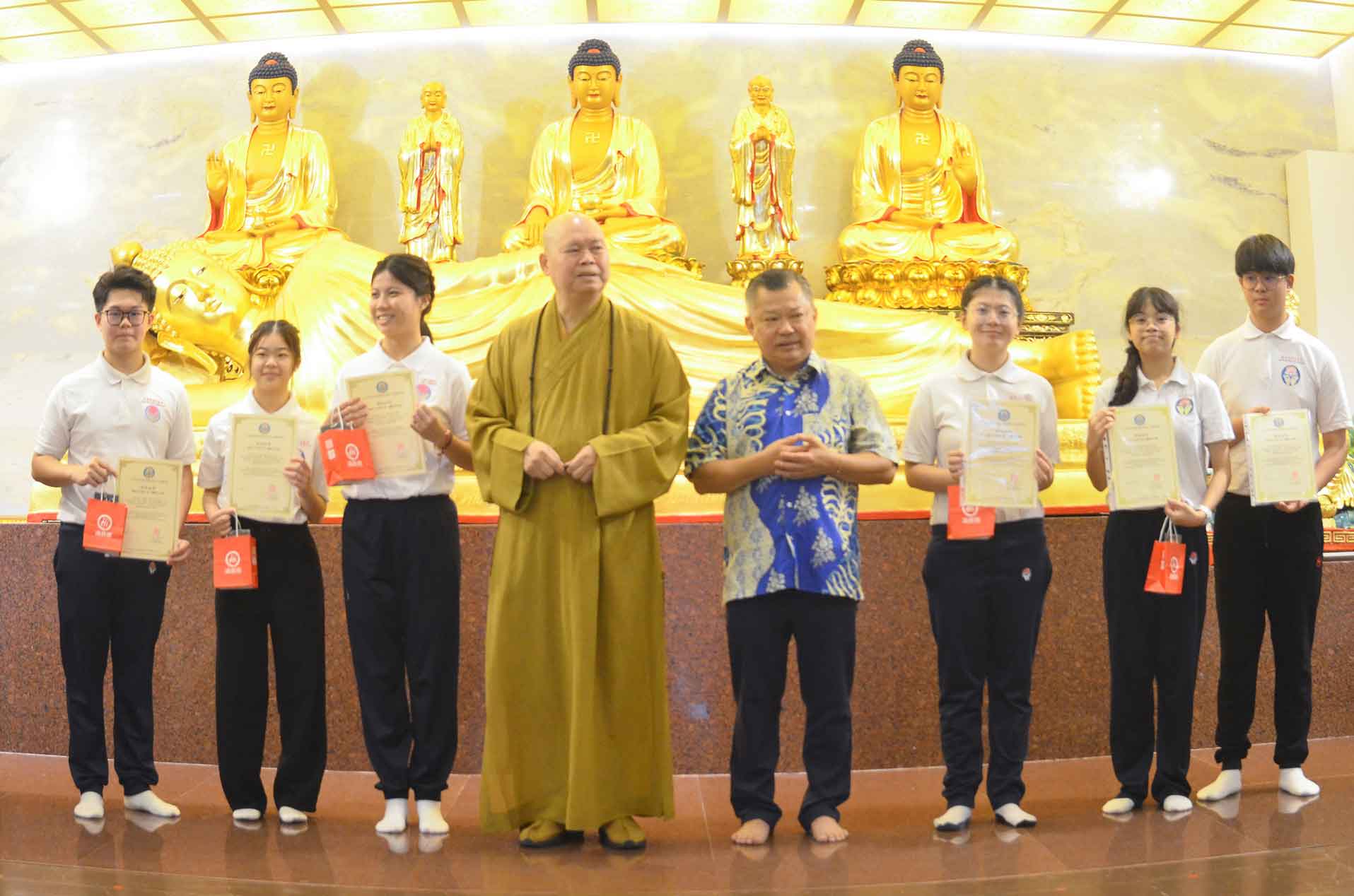颁奖嘉宾有:八打灵观音亭住持明吉法师、福利基金董事史元春护法、明印法师、性道法师及毕业班老师方俊信老师。