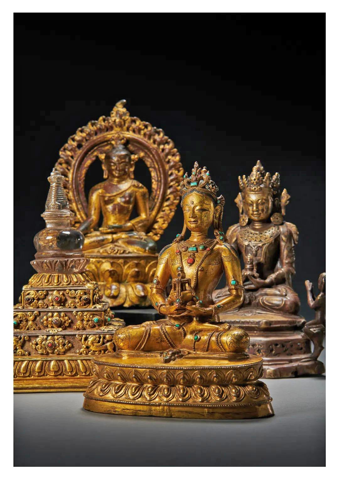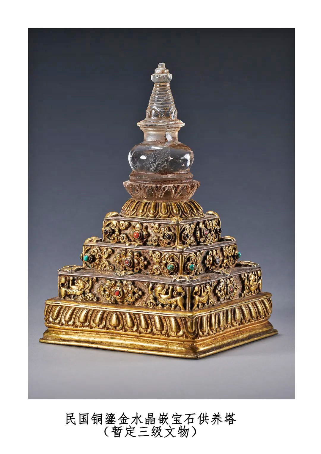 其中,5件金铜佛造像和1件铜鎏金水晶嵌宝石供养塔制作工艺精良,专家建议暂定为三级文物。特别是1尊明末清初的黄铜同侍从无量寿佛造像,呈现出显著汉藏融合风格,其六面形台座多见于汉藏风格唐卡与壁画,在铜造像中较为罕见。