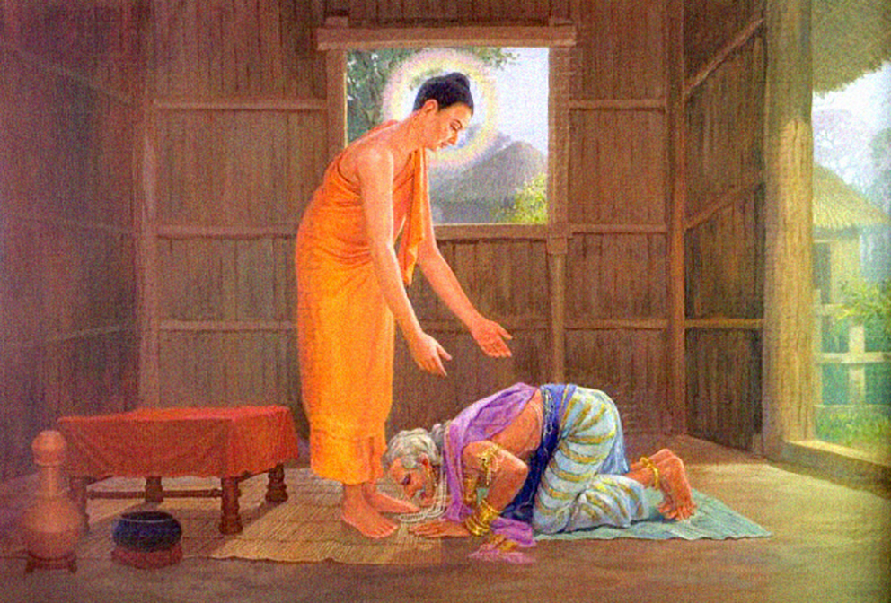有一天他来到佛陀所住的地方,一见到佛陀,当下神智清醒,并向佛陀顶礼。悲伤的父亲说:“我没有儿子,只有这个女儿,爱惜她如手中珠玉,让我忘掉一切忧愁。