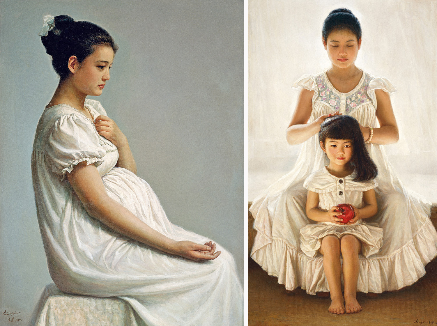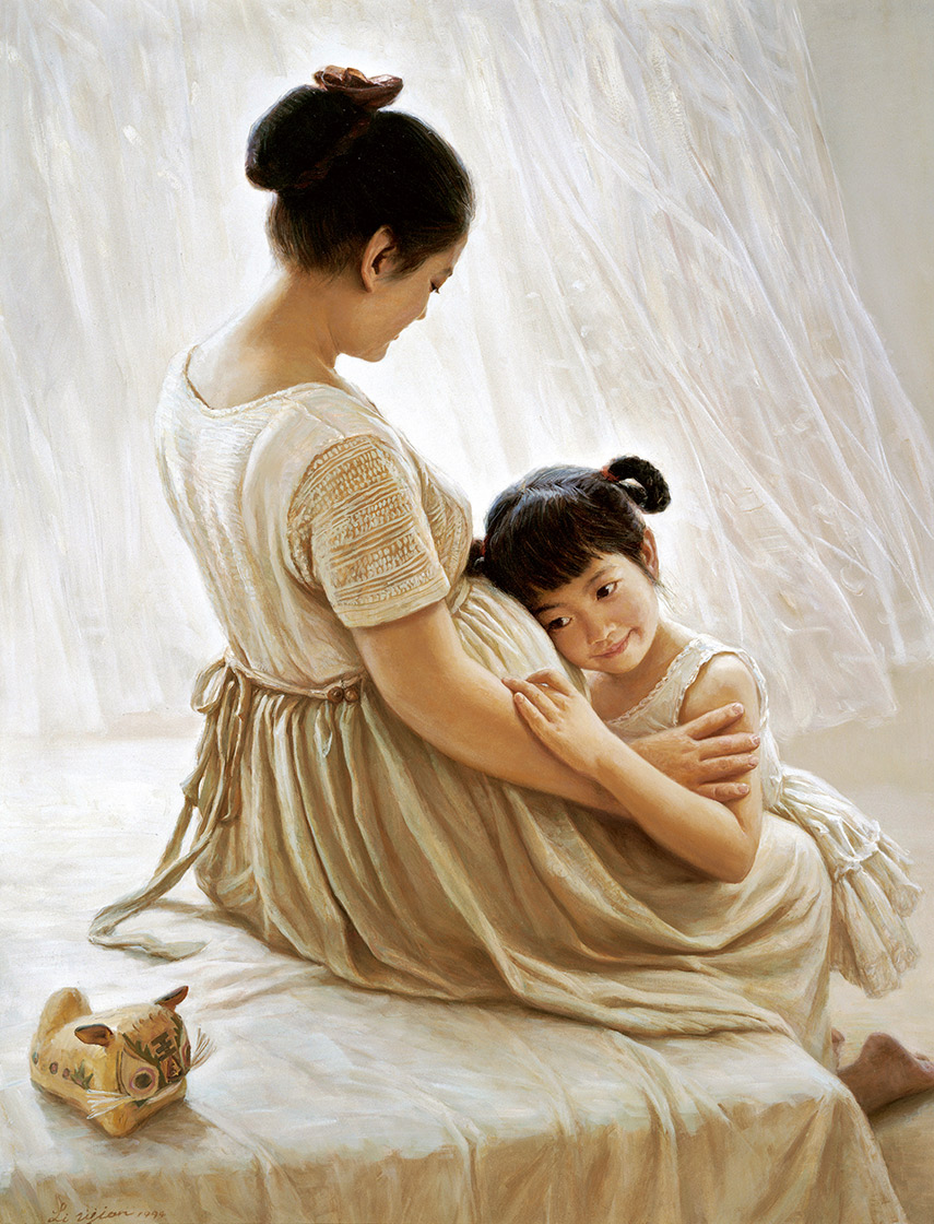 从大陆带出来的那幅“孕”,也是那时随著生活的转变,延续了另外8幅,从“摇篮”、“童话” “唐诗”、“新衣”等画至第8幅,想不到新题材时妻子又有孕了,于是画了女儿站在妻子腹前的“胎声”,及成了十幅圆满温馨的母女系列。