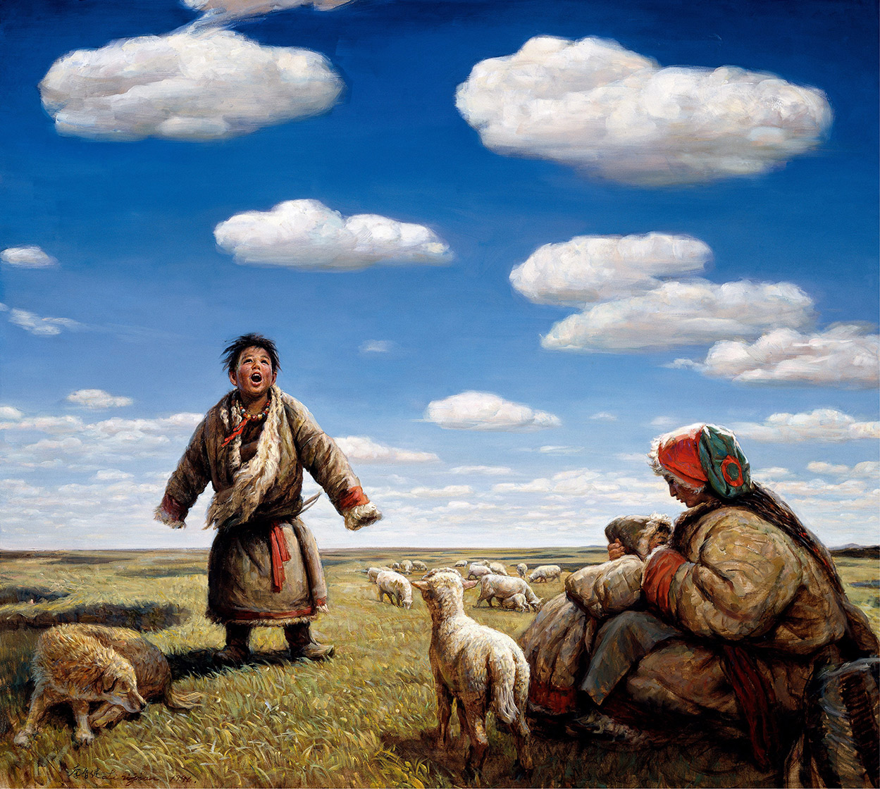 亲亲母女图,洋溢无限温柔思情;辽阔的旷野引入沉思的空间。