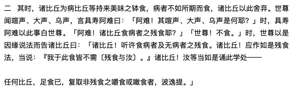 当出家人在早餐时说出,食物已足够,类似这样的表达是针对早餐的一部分,那么中午还能否进食呢?此时需要另外一位比丘尊者在场互做残食法,否则继续接受食物,每吃一口即犯波逸提。
