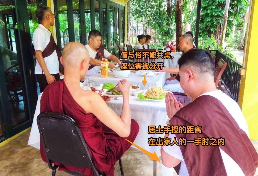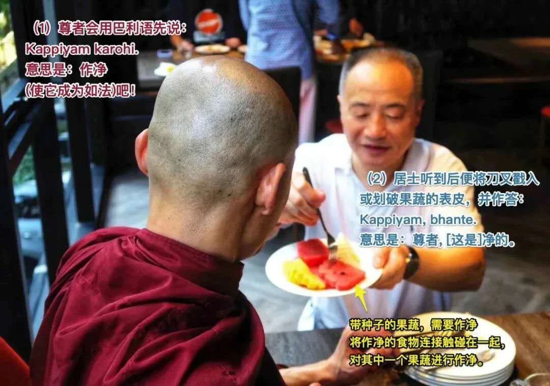在实际供养出家人饮食的部分中,僧俗互动中需留意的,因为如果语言不够小心可能会让出家人违犯戒律,或者影响出家人下一餐的正常食用。