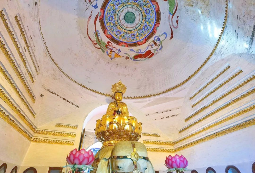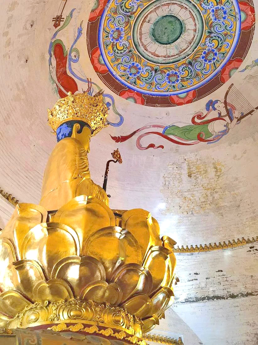 无梁殿的穹顶为窿形拱顶,下方则是一个正方形,充分展现了"天圆地方"的传统思想。穹窿殿顶上,还绘着四位飞天的仙女,殿顶四角还饰有狮、象、鹿等瑞兽。