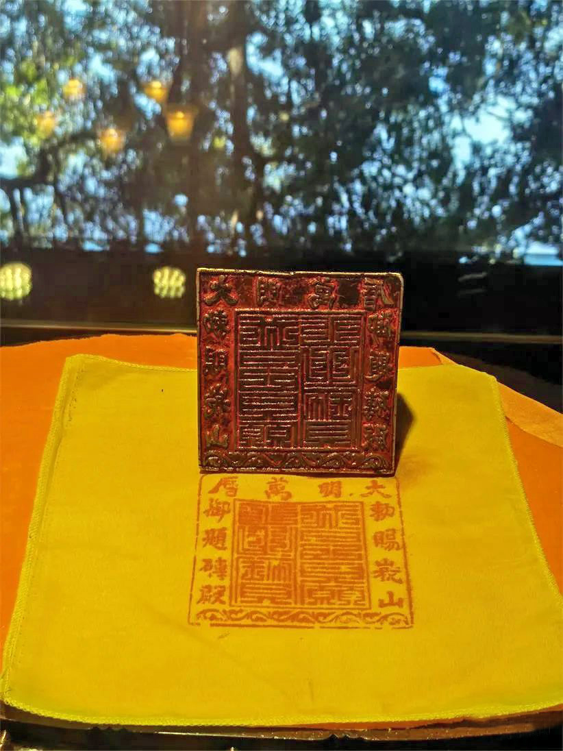万历宝印长宽各13厘米,正中筹刻“普贤愿王之宝”六字,上方刻楷体“大明万历”,左边刻“御题砖殿”,右边刻“敕赐峨山”。因是帝王赏赐,虽为铜质僧人亦尊称为金印,是佛法传承中僧宝清净德行的显露。