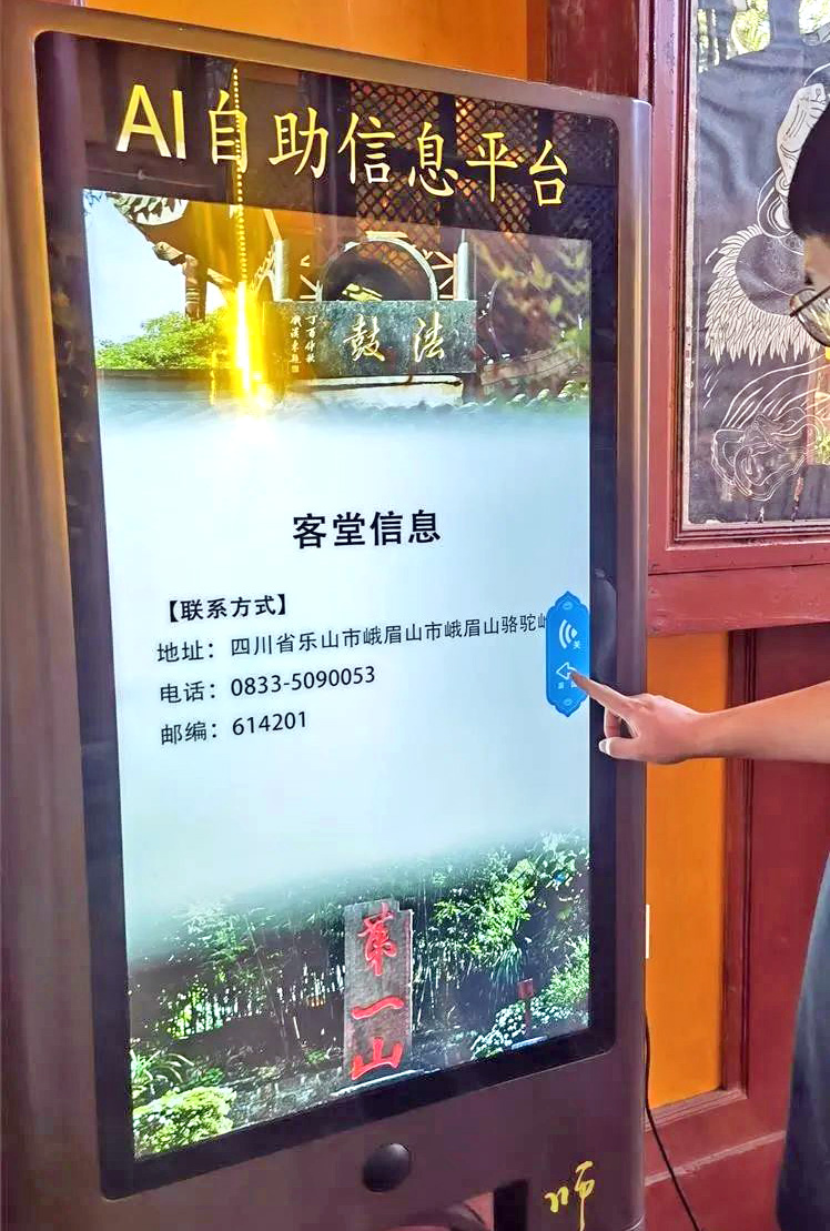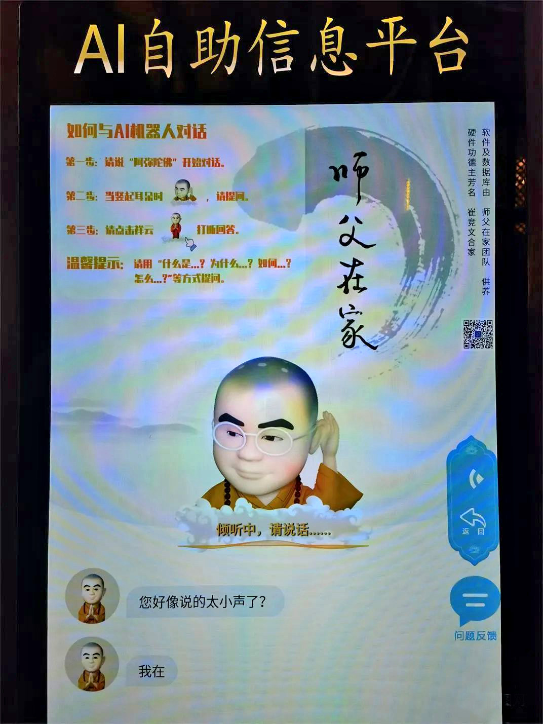 寺院内架构了AI自助信息平台,智能一体机采用了最尖端的AI语音对话功能,通过语音问答的方式进行人机交流,还可以通过一体机预览寺院的法会信息及往期法会,扫码便可在线供养,并祈福许愿。