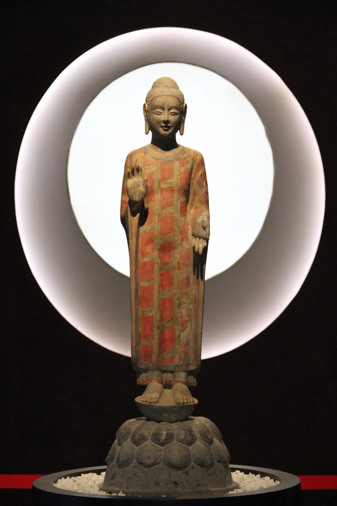 两汉之际佛教艺术东传入中国,早期的佛造像就有明显的犍陀罗风格,公元4-6世纪笈多王朝时代的泥塑也给佛造像的手势、坐姿奠定了基本范式。