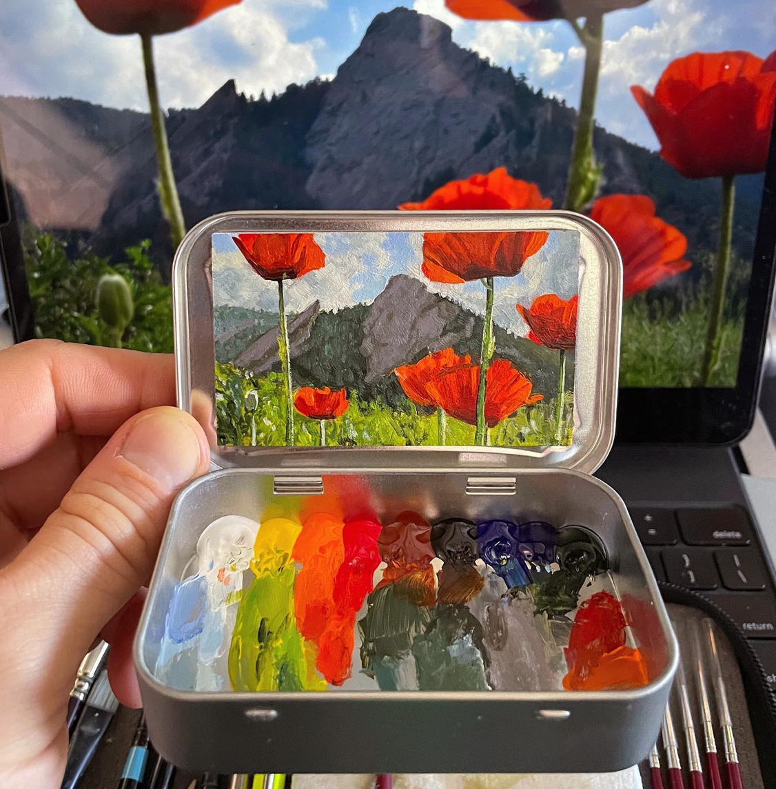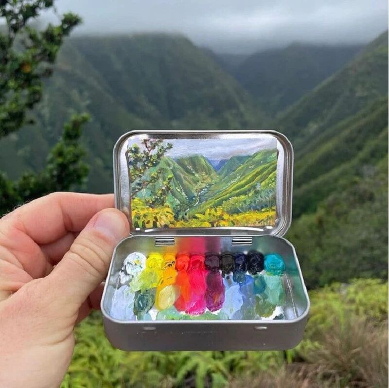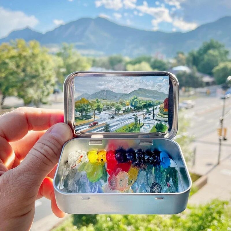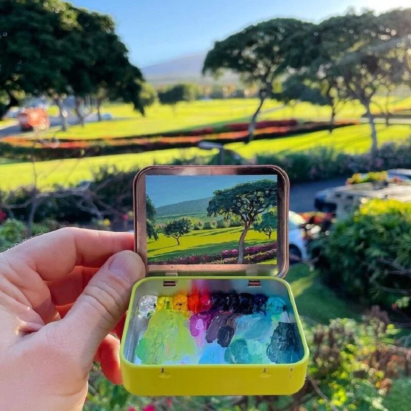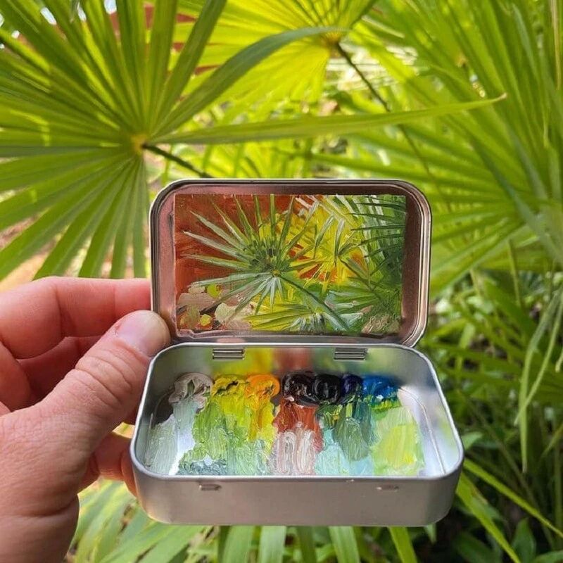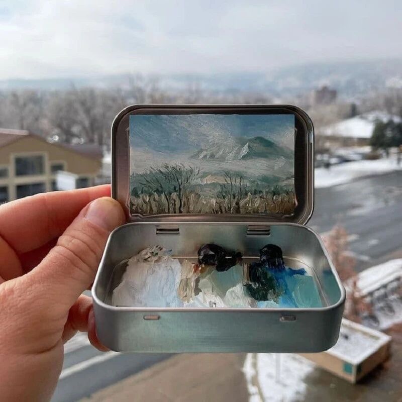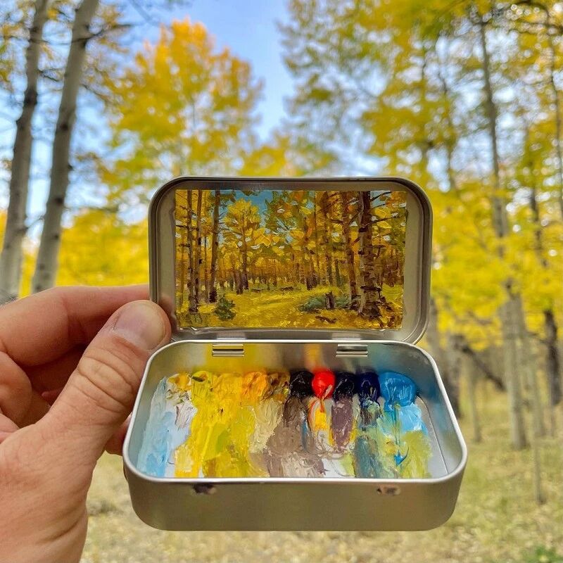 Robinson 热爱捕捉自然的瞬间,他总是在外旅行时带上空闲的糖果盒,用来保存那些转瞬即逝的美好记忆。通过把一块薄木板粘在糖果盒的盒盖背面,他便得到了一个理想的创作平台。而原本用于盛放糖果的盒底,则成了他的调色盘,让各种颜料的色彩在此自由混合,为他的作品增添了丰富的层次和光影效果。