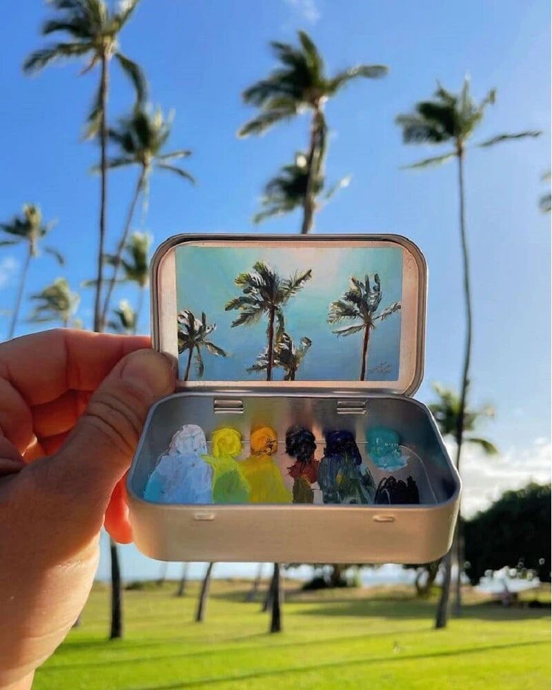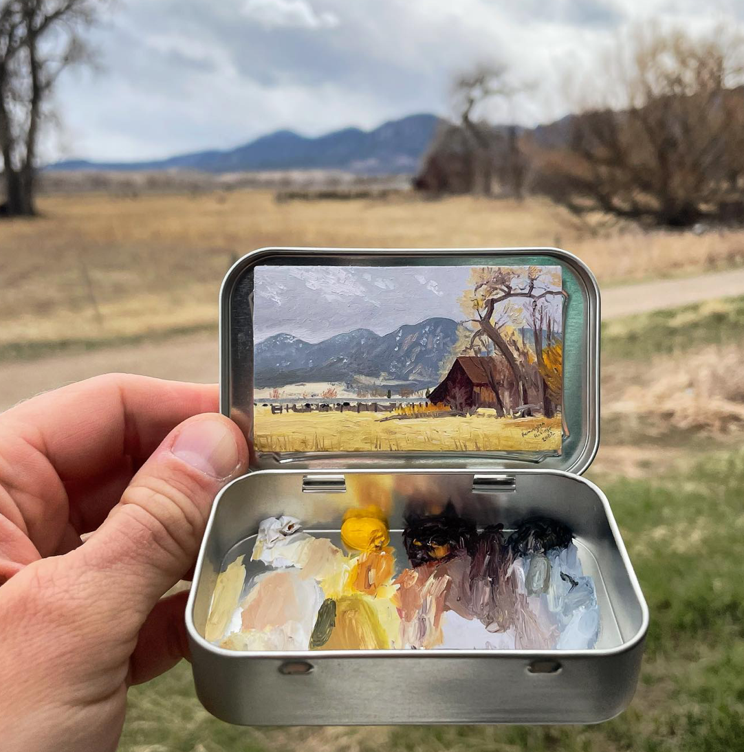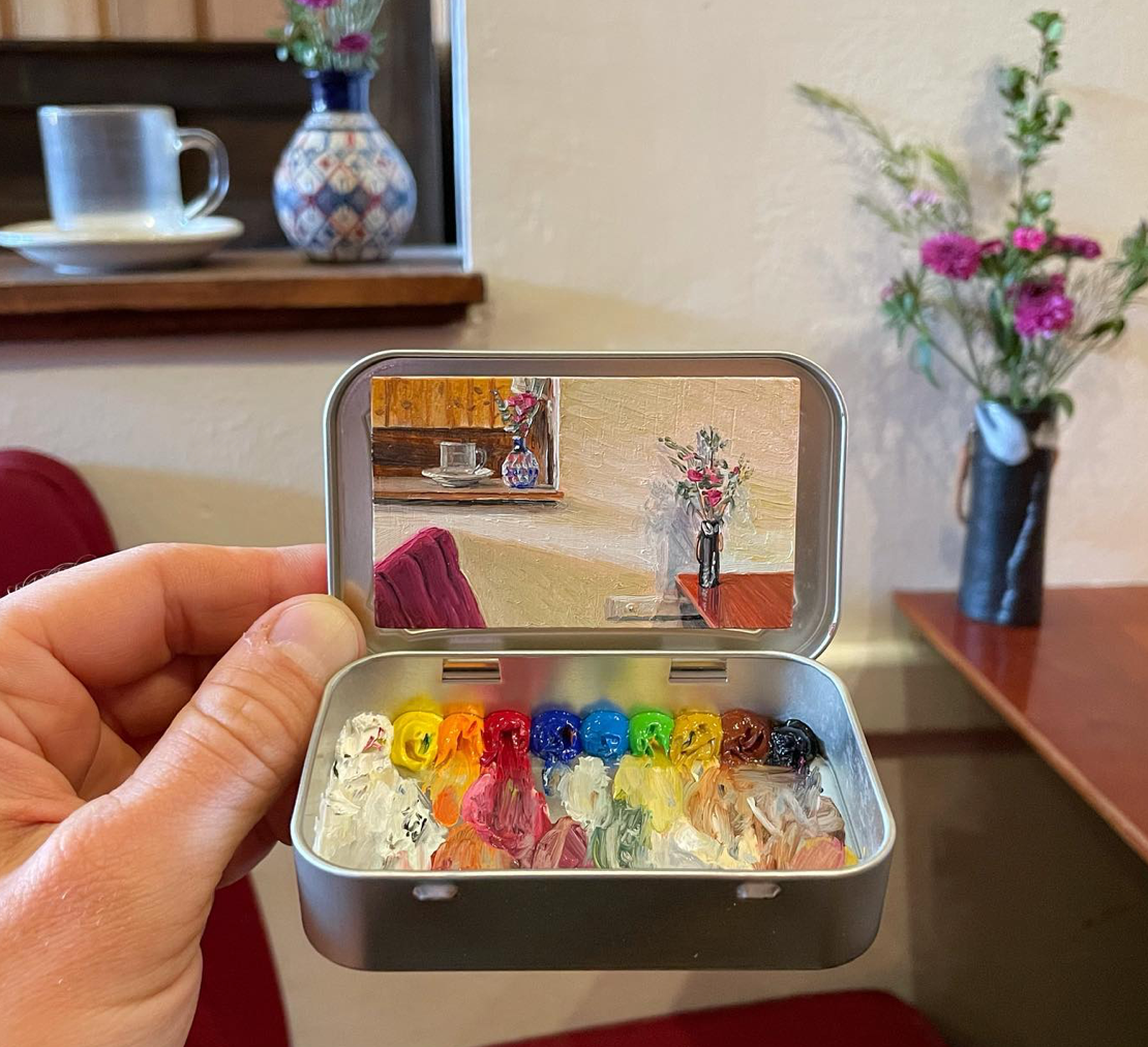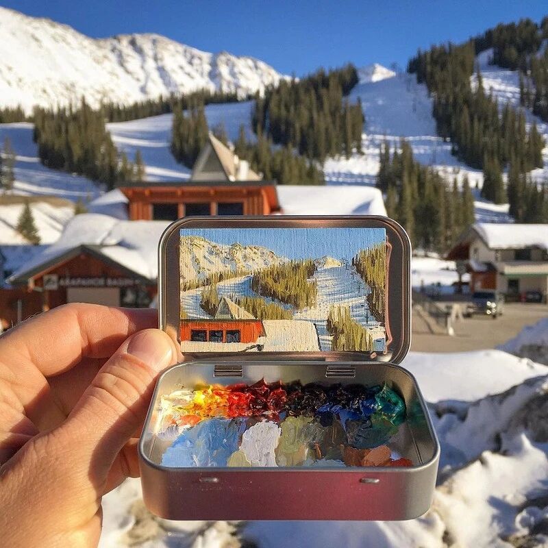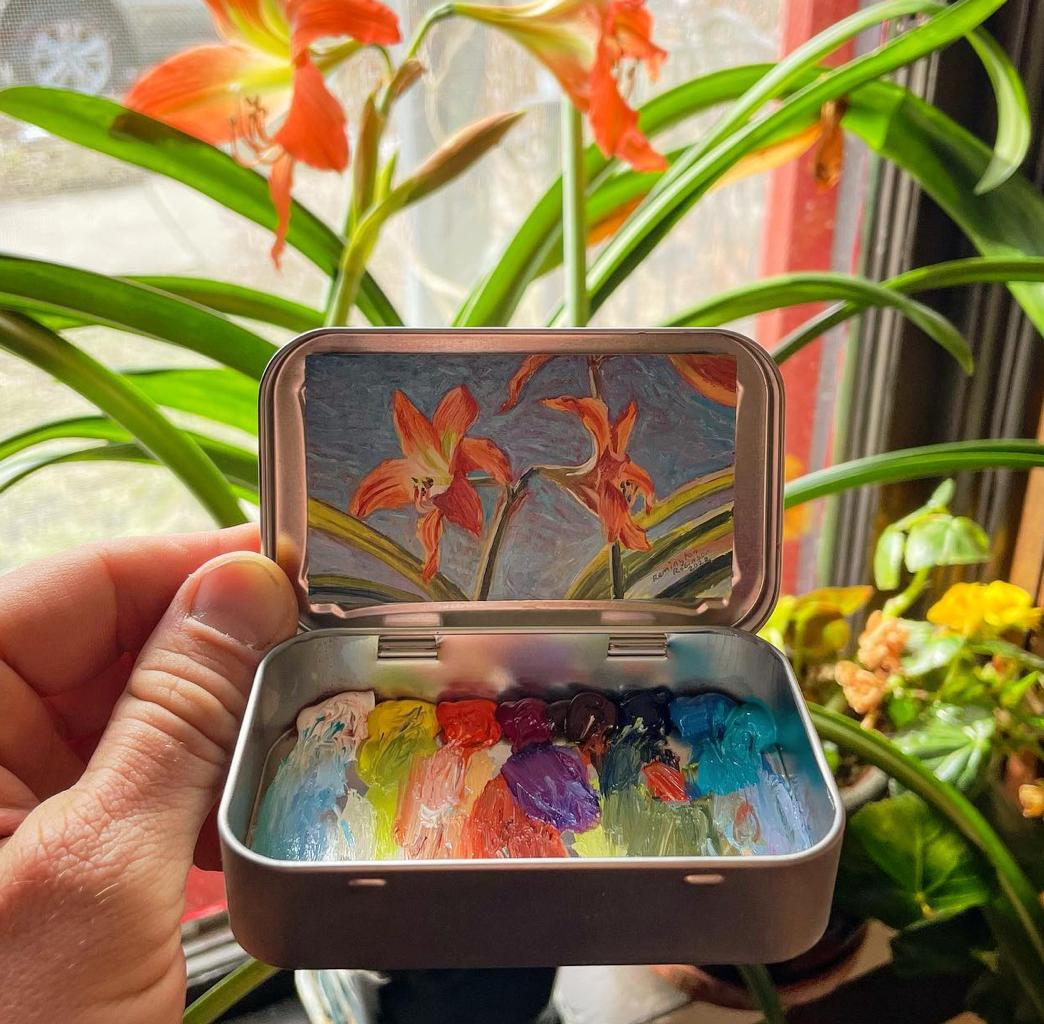 Robinson 热爱捕捉自然的瞬间,他总是在外旅行时带上空闲的糖果盒,用来保存那些转瞬即逝的美好记忆。通过把一块薄木板粘在糖果盒的盒盖背面,他便得到了一个理想的创作平台。而原本用于盛放糖果的盒底,则成了他的调色盘,让各种颜料的色彩在此自由混合,为他的作品增添了丰富的层次和光影效果。