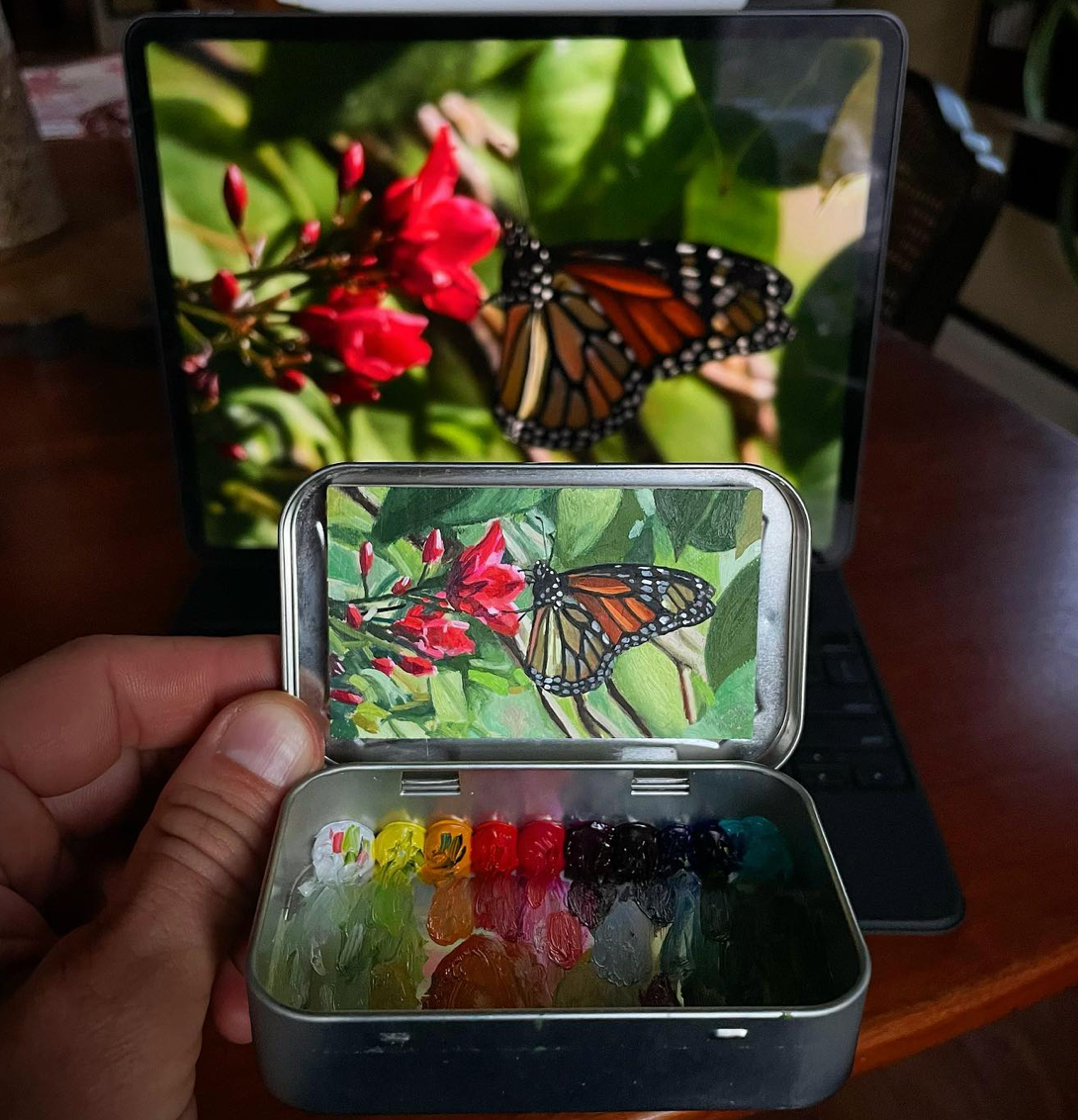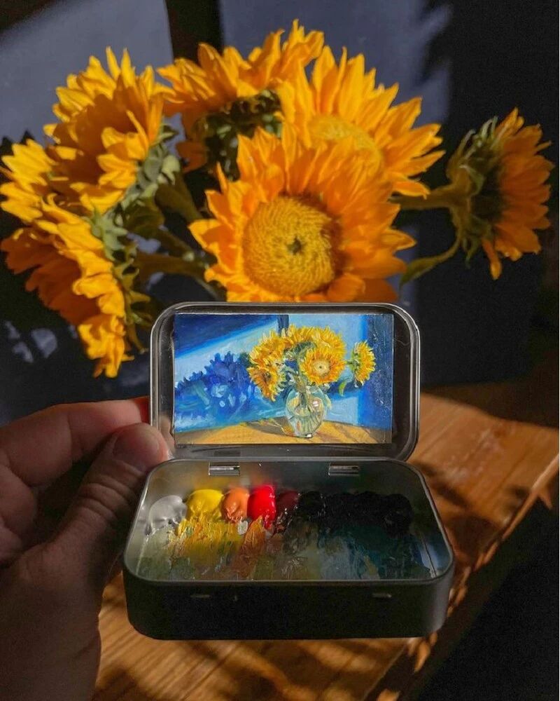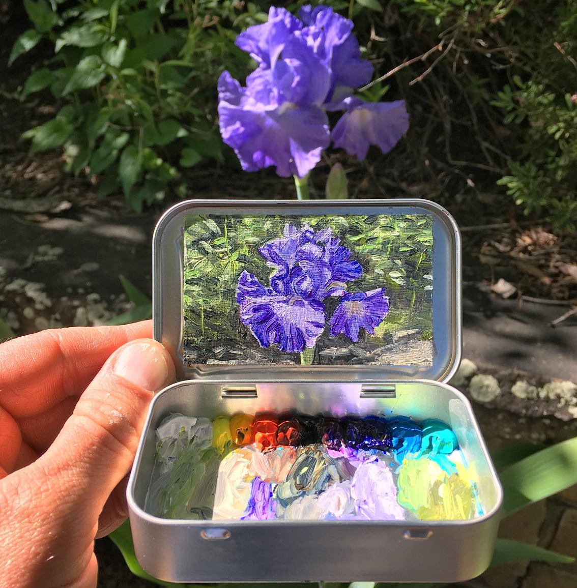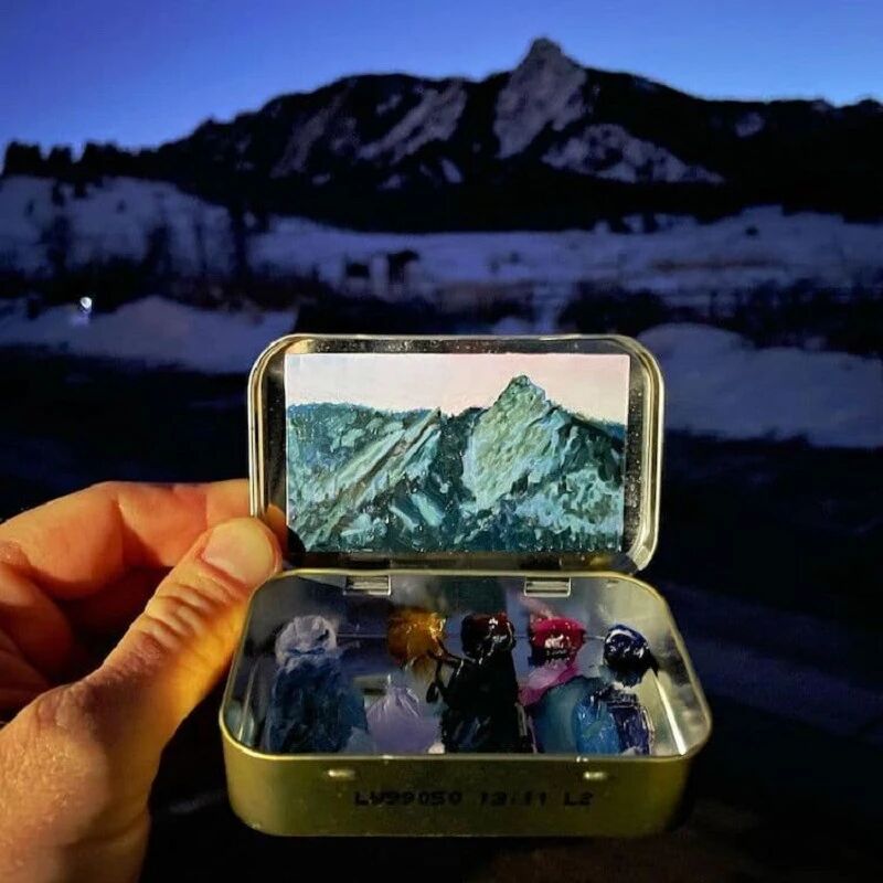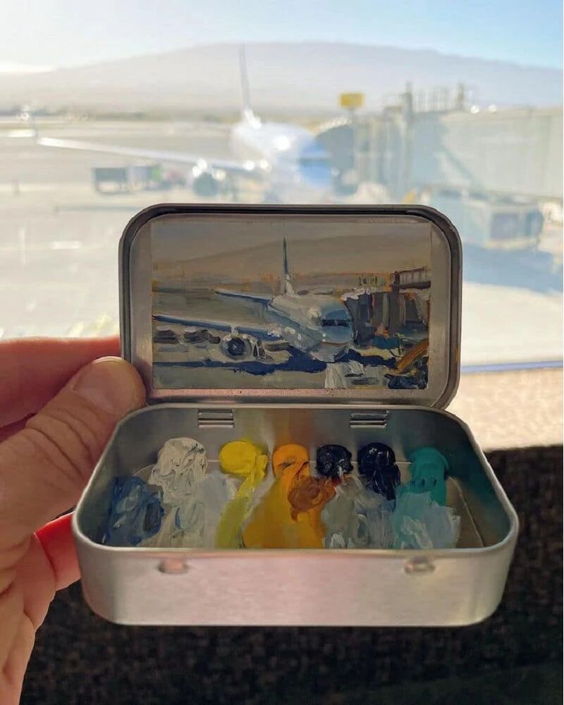 Robinson 热爱捕捉自然的瞬间,他总是在外旅行时带上空闲的糖果盒,用来保存那些转瞬即逝的美好记忆。通过把一块薄木板粘在糖果盒的盒盖背面,他便得到了一个理想的创作平台。而原本用于盛放糖果的盒底,则成了他的调色盘,让各种颜料的色彩在此自由混合,为他的作品增添了丰富的层次和光影效果。