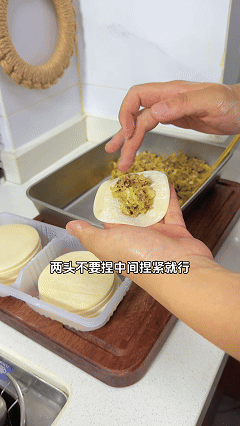 第二步,取饺子皮,放适量馅料,对折捏合中间,两端留口(经典锅贴形状),平底锅热锅刷薄油,将锅贴整齐码入,等底部变色后倒入半碗淀粉水,盖上锅盖,转中大火焖煮,至水分基本收干,撒上芝麻就可以出锅了,加入卷心菜后,馅料口感更丰富、层次更多,且能增加清甜和爽脆度~