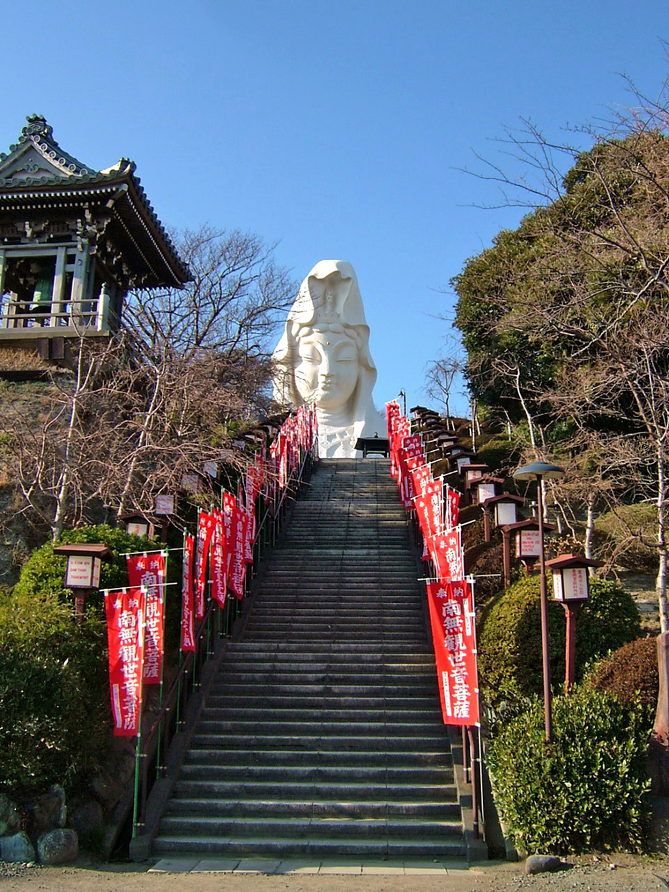 神奈川县鎌仓市的大船观音寺建在山丘之上,正如寺名,该寺的象征便是巨大的观音像。巨大的白衣观音像全长约25米,于1929年开始建造,中间因战事等原因搁置,最终花费了30多年才建成。其柔和的表情交相辉映,仿佛能把一切包容起来。在每年秋季举办的Yume观音祭时,可以欣赏到来自亚洲各地的音乐及舞蹈表演。