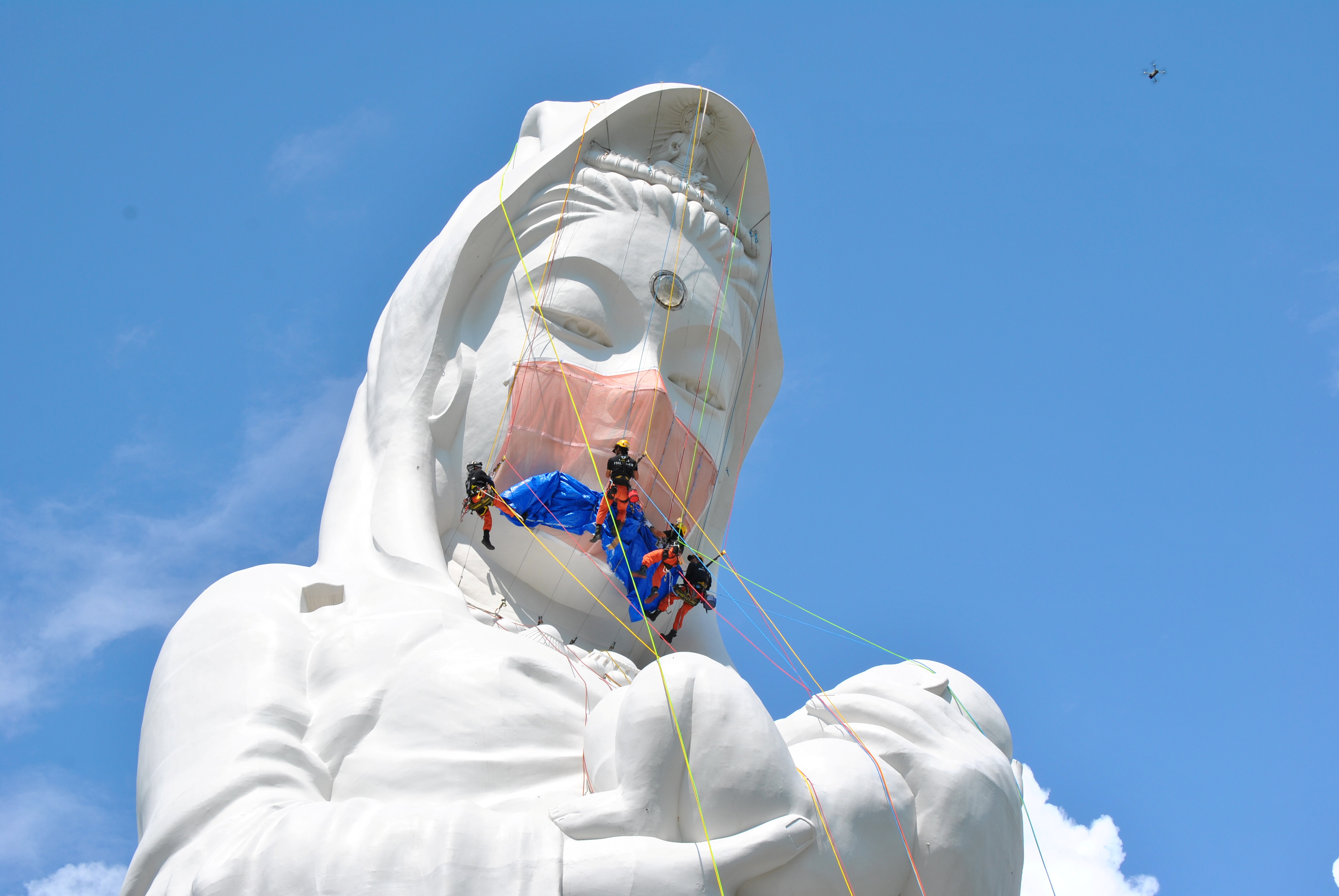 给这尊巨大的观音像戴口罩也费了不少功夫。4名工人从观音像头顶吊下绳索,降到嘴部附近。由于午间遭遇强风,施工人员只能暂时停工。下午3点,口罩佩戴完成。