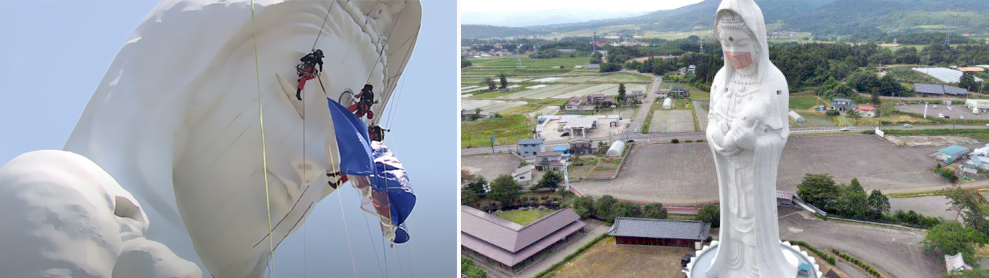 据日本《读卖新闻》报道,这尊会津慈母大观音像高57米,会津若松市的景色能够一览无余。今年2月福岛海域发生地震后,观音像出现了龟裂。观音像管理方——法国寺会津别院在委托工程方进行修复时提出,可以给观音带一个“象征疫情退散的口罩”。