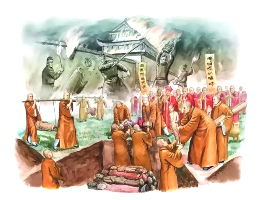 史载,作为古时的战略要地,青州曾经宋金多次争夺,南宋建炎年间几经战火洗掠,龙兴寺及其佛像在战争中自然难逃厄运,于是被虔诚的信徒们秘密埋藏起来;也有学者认为是“灭佛”运动的影响,中国历史上曾经发生过四次较大的灭佛事件,佛教称为“法难”,即北魏太武帝灭佛、北周武帝灭佛、唐武宗灭佛、五代后周世宗灭佛,佛教史上称为“三武一宗”。北宋宋徽宗笃信道教,史载:“宋政和元年(1111年)正月,毁东京祠庙”,这或许就是龙兴寺毁佛藏经的直接原因。