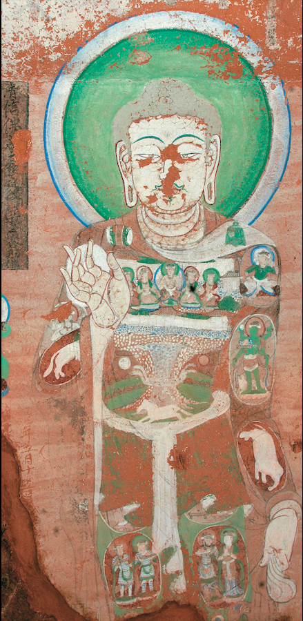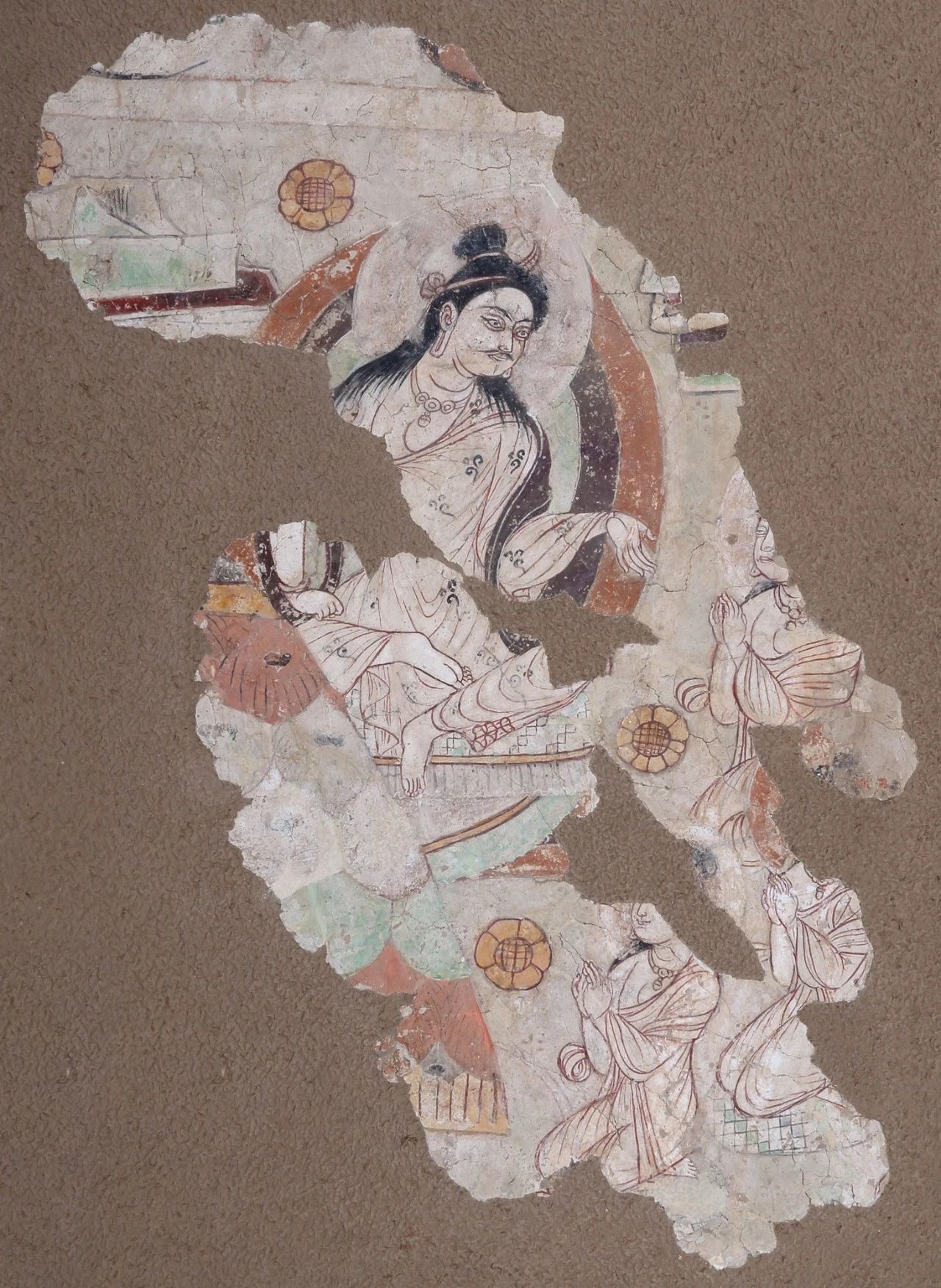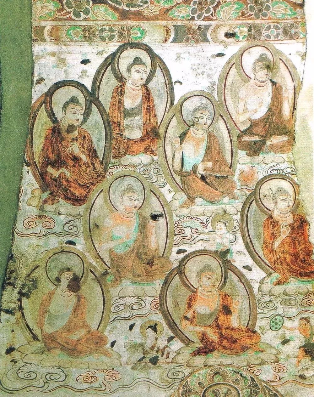 在车师前国的时代,佛教已经流行于高昌。公元四世纪下半叶,佛教正式成为国教,以大乘教法为主。《出三藏记集》卷二记载,高昌沙门法众曾经应北凉的沮渠蒙逊之请,在北凉都城张掖译出《方等檀特陀罗尼经》四卷。北凉沮渠蒙逊遣使高昌求取《大般涅槃经》的胡本,由昙无谶译出。然而,昙无谶感慨此经的品数不足,乃发愿寻得完足的经本。到南朝宋文帝之时,道场寺慧观奏请文帝派遣高昌沙门道普等十人,西行求取《涅槃经》后分,道普行至长广郡涉水,船破伤足,死于外地。临终之时,道普感叹《涅槃经》后分与宋地无缘。![]()