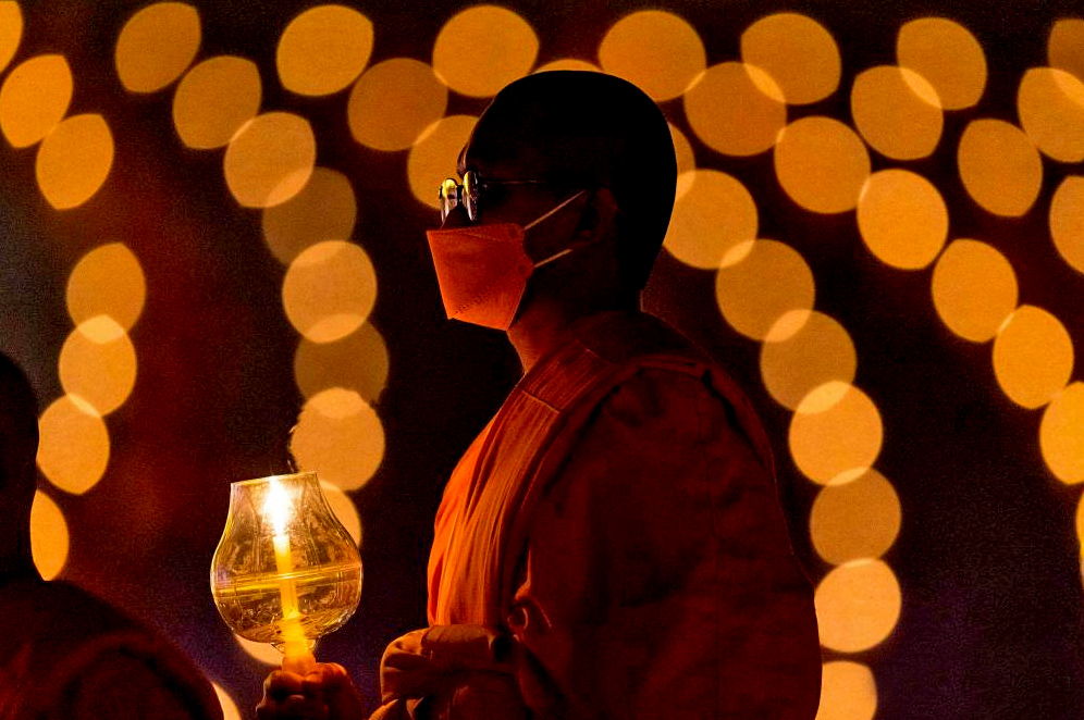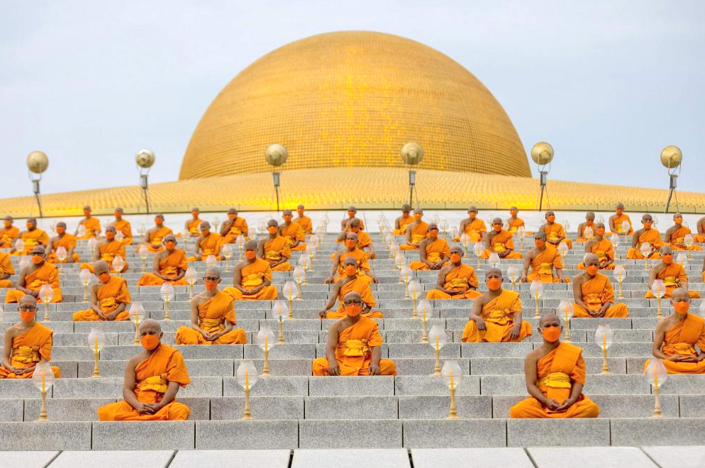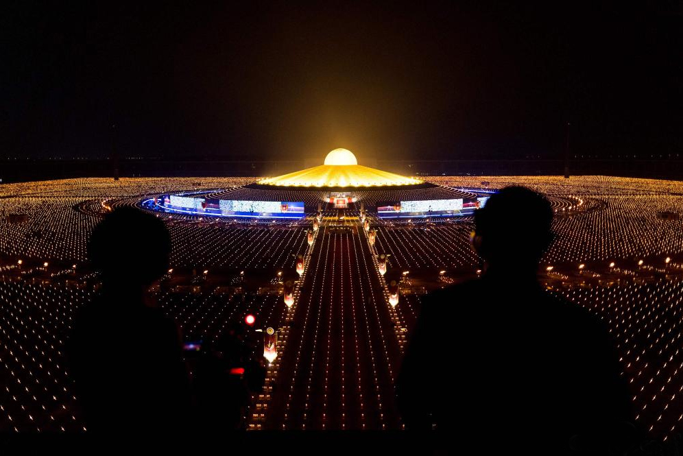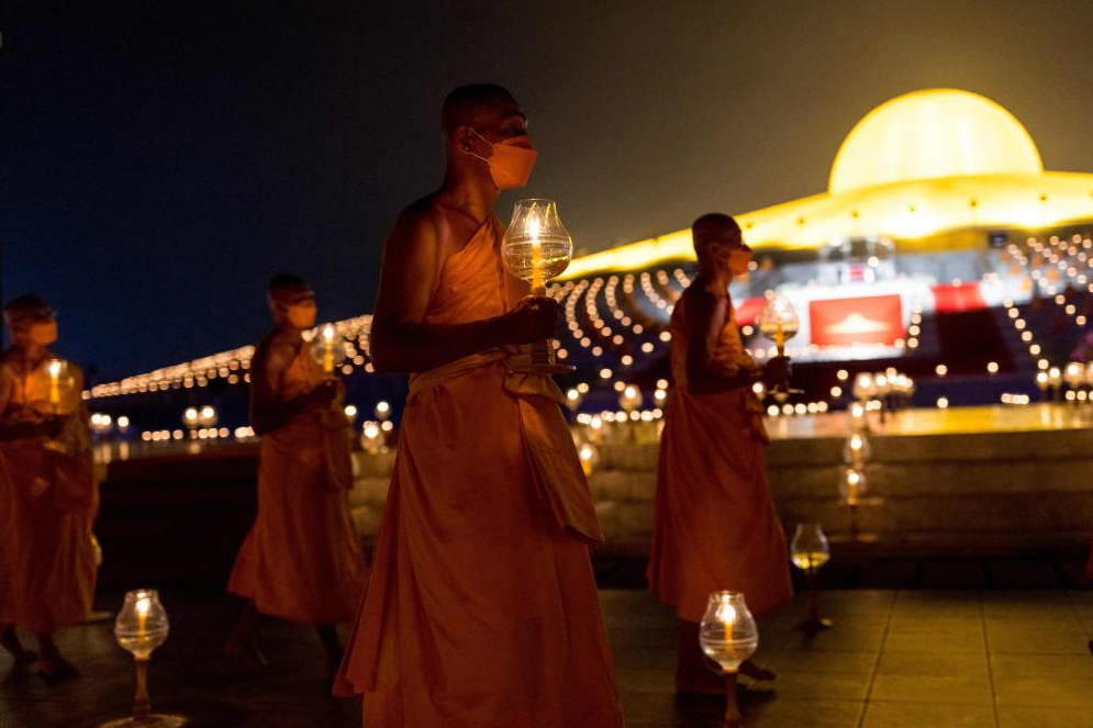 泰国巴吞他尼府,泰国僧侣在法身寺庆祝万佛节。万佛节为泰国传统佛教节日。在泰国的大小寺庙,民众从傍晚时分开始巡礼朝拜活动,以表达对佛陀的敬意,并祈祷获得佛菩萨的护佑。