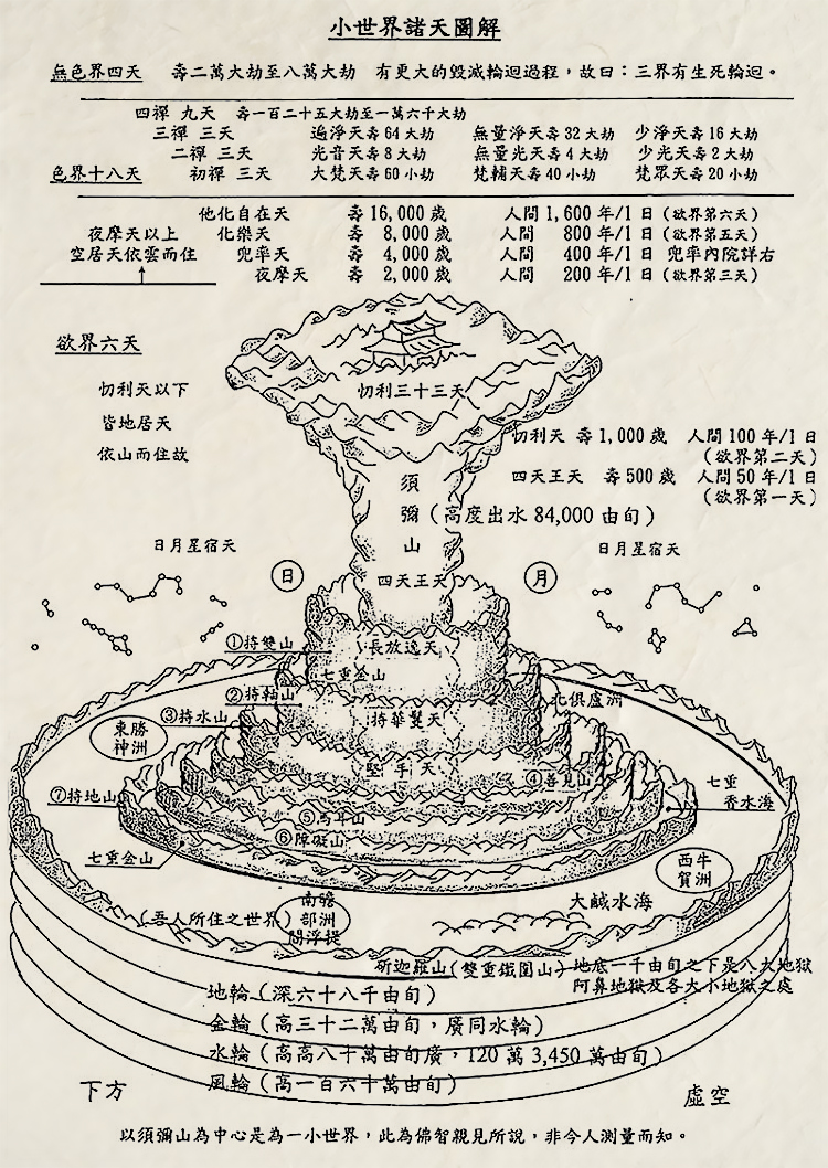 每一世界最下层系一层气,称为风轮;风轮之上为一层水,称为水轮;水轮之上为一层金,或谓硬石,称为金轮;金轮之上即为山、海洋、大洲等所构成之大地;须弥山即位于此世界之中央。水面以上分上下两段,下段分为四层:第一层,名坚手天;第二层,名持鬘(man)天;第三层,名恒憍(jiao)(亦译常放逸)天。为四天王所统帅之夜叉神所居,属于鬼类,非天道所摄。(一说第三层之上还有日月星宿天,为日月星宿诸神所居);第四层,为四天王天,与日月在一水平面上。