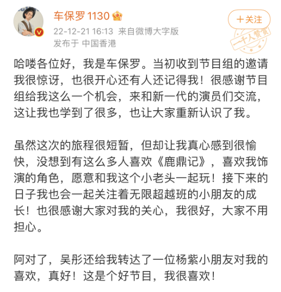 后来,大家知道车保罗为了参演这个节目辞去了工作。