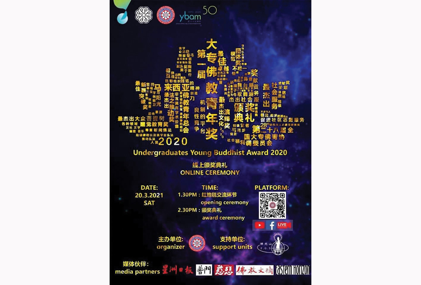 2019年新冠状肺炎病毒飞速蔓延全球,世界各国实行封国封城,马来西亚也实行全国行动管制令,筹办了的“第一届大专佛教青年奖”颁奖典礼也一直无法举行。2021年3月20日筹委会排除一切困扰决定来一个创新的线上颁奖礼,场地选在雪州佛光山东禅寺。颁奖典礼成功圆满举行,鼓舞了一颗颗年轻的心,过去的努力看到成果;在疫情笼罩之下,人们身心遭受困苦的当儿,看到佛法之光,为沉郁社会带来温暖与希望。