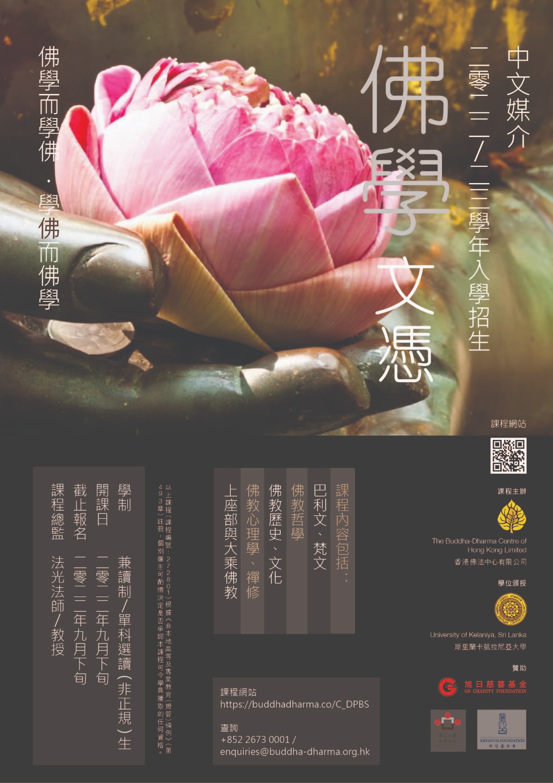 香港佛法中心为有志于学习佛法之人士提供巴利文暨佛学文凭、文学硕士(佛学)、哲学硕士(佛学)及哲学博士(佛学)等专业的学术课程。