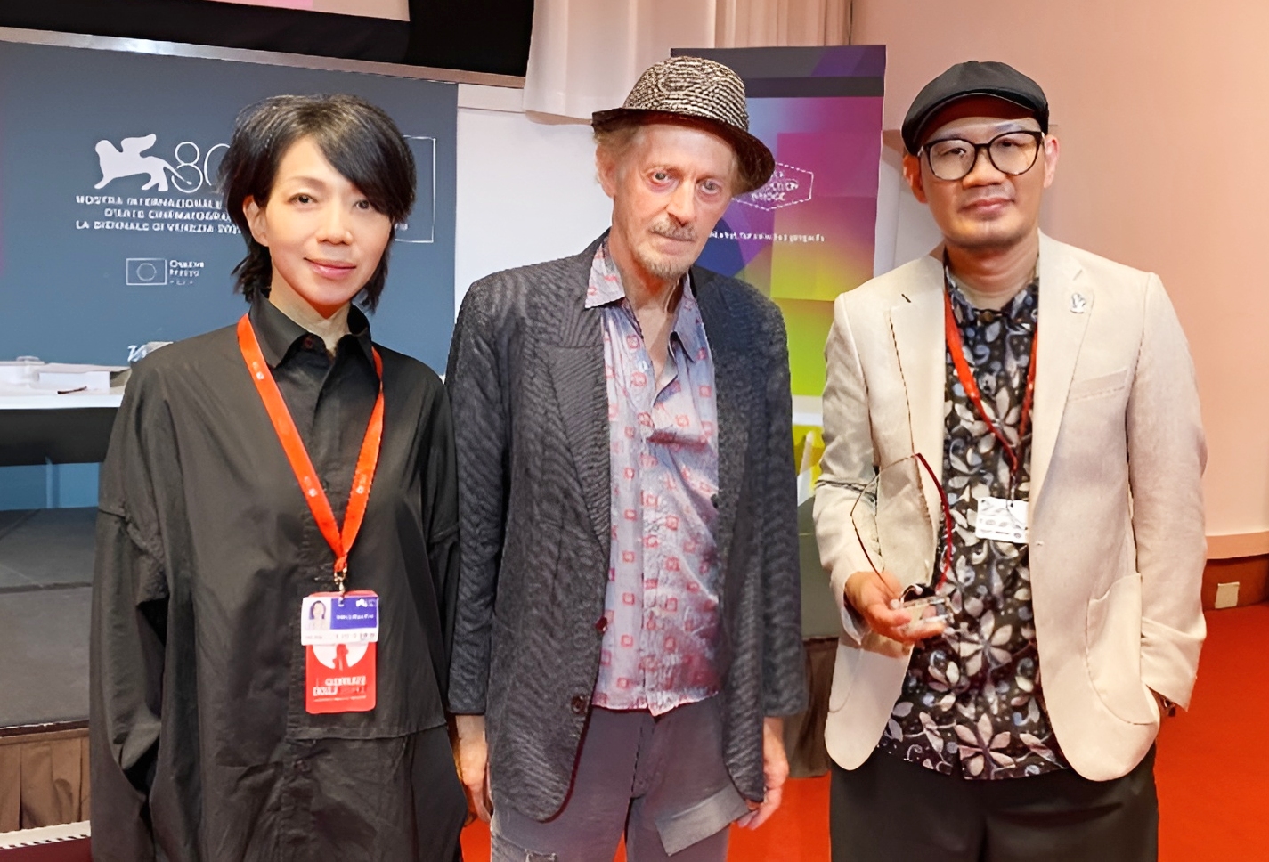 左为万芳、中为费里尼御用编剧卡瓦佐尼及张吉安在《第80届威尼斯影展》。