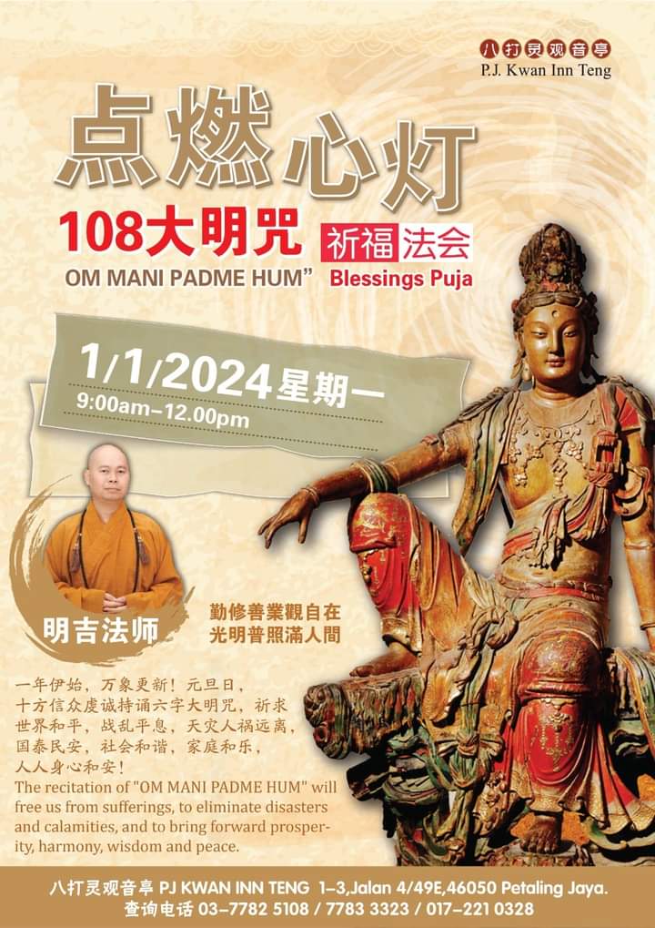 In welcoming the year of 2024, PJ Kwan Inn Teng will be organizing 【The Om Mani Padme Hum Blessing Puja】 from 9:00am-12:00pm on 1/1/2024(Monday) at the temple premises. Devotees are welcome to participate in this blessing puja. May the Buddha blesses on everyone with peace and auspiciousness.