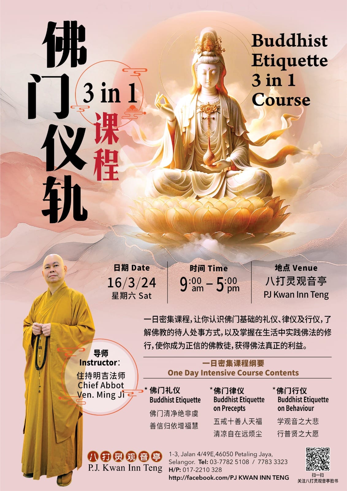 一日密集课程,让你认识佛门基础礼仪,了解佛教的待人处事方式,以及掌握在生活中实践佛法的修行,使你成为正信的佛教徒,获得佛法真正的利益。