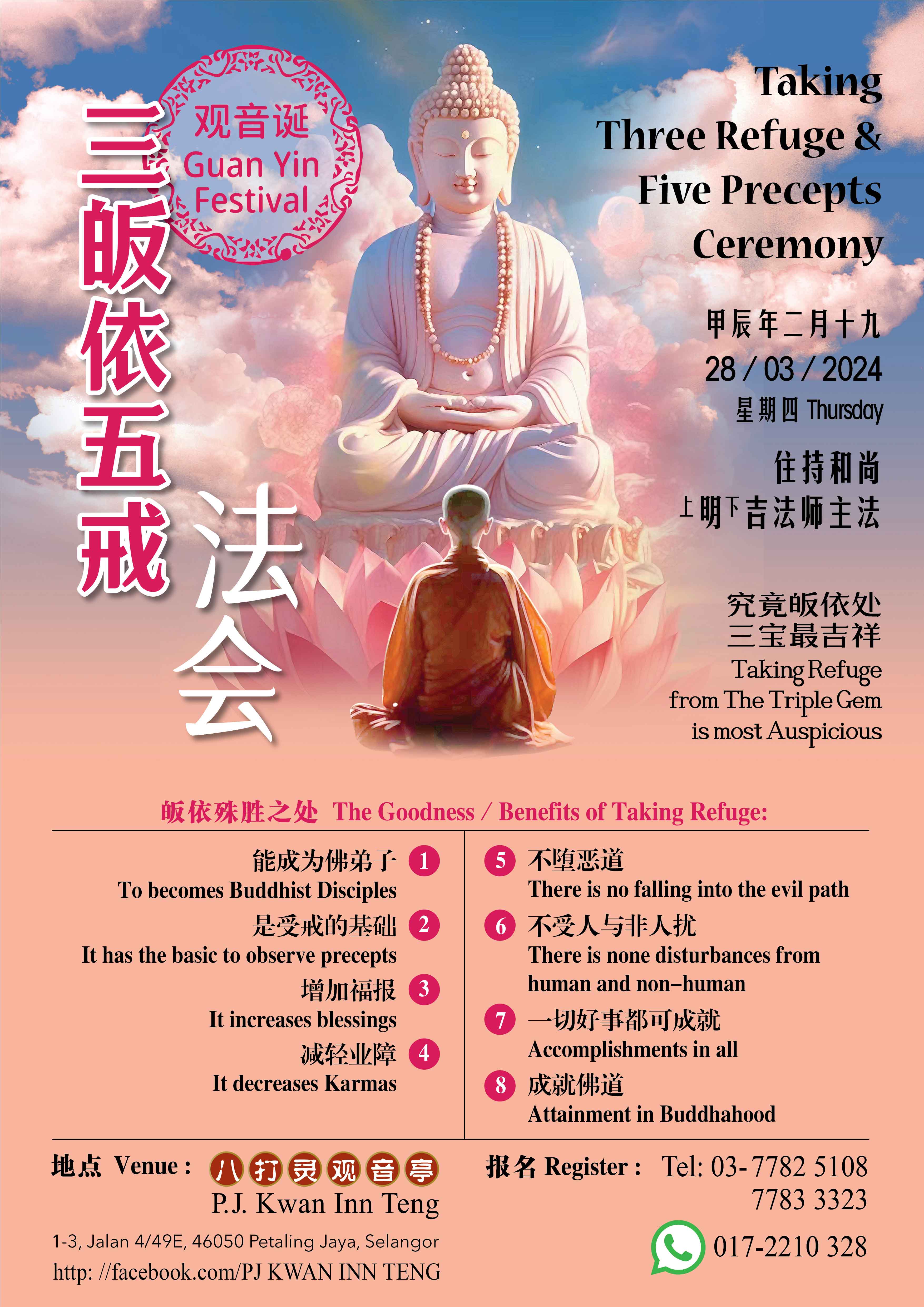 “The Three Refuge & Five Precepts” will be ordained by Venerable Ming Ji at 9am. Devotees who wish to participate can call-up for registering. Participants ought to wear proper attire and arrive temple at 8:30am.