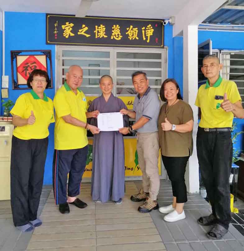 莫师兄(右一起)和燕琴把善款捐献予吉隆坡净愿慈怀之家,由吉隆坡净愿慈怀之家院长杨宝美(左起)、创办人刘水星、宗教顾问释常妙法师接领。右一是援助助理萧荣富。