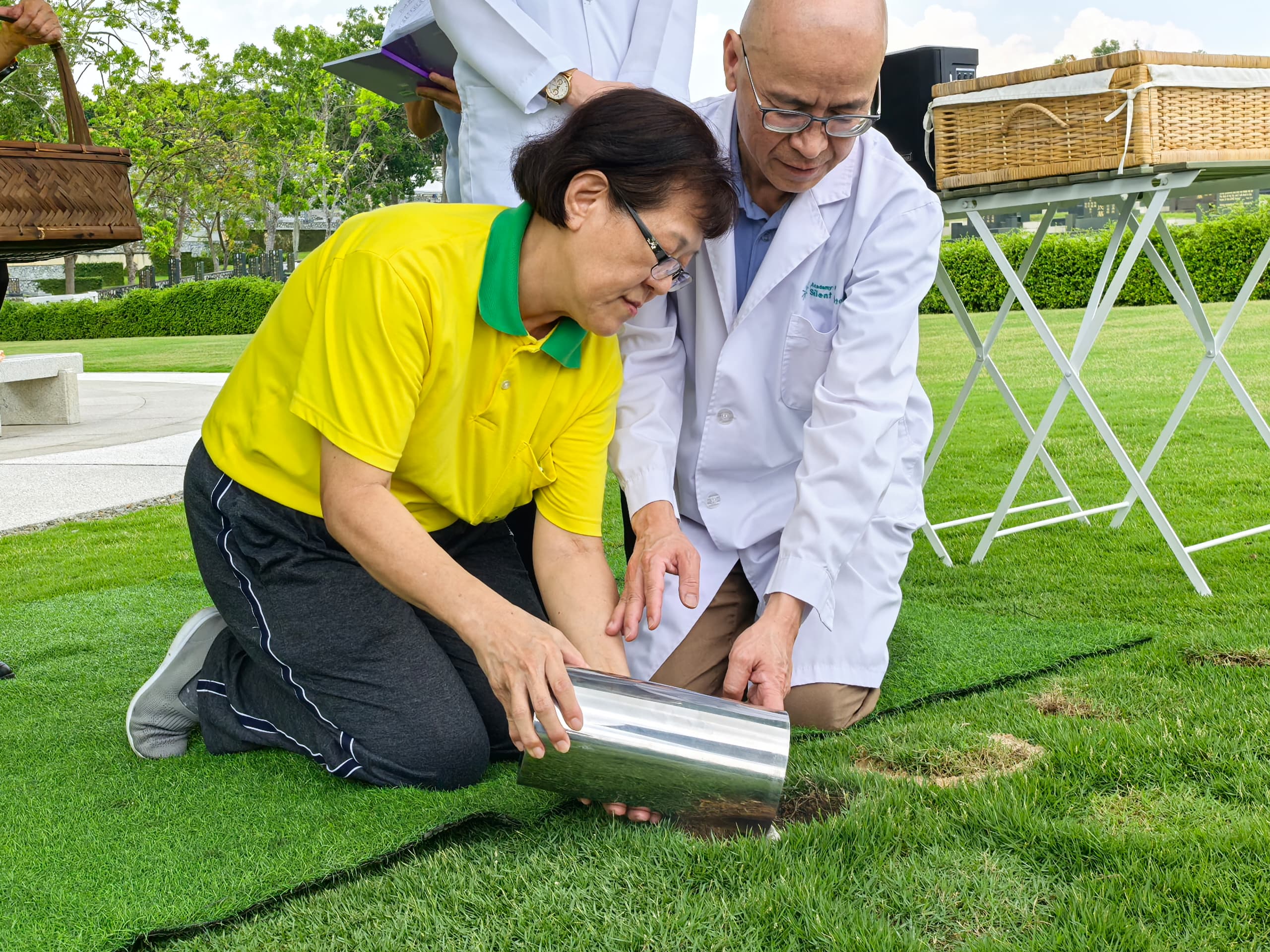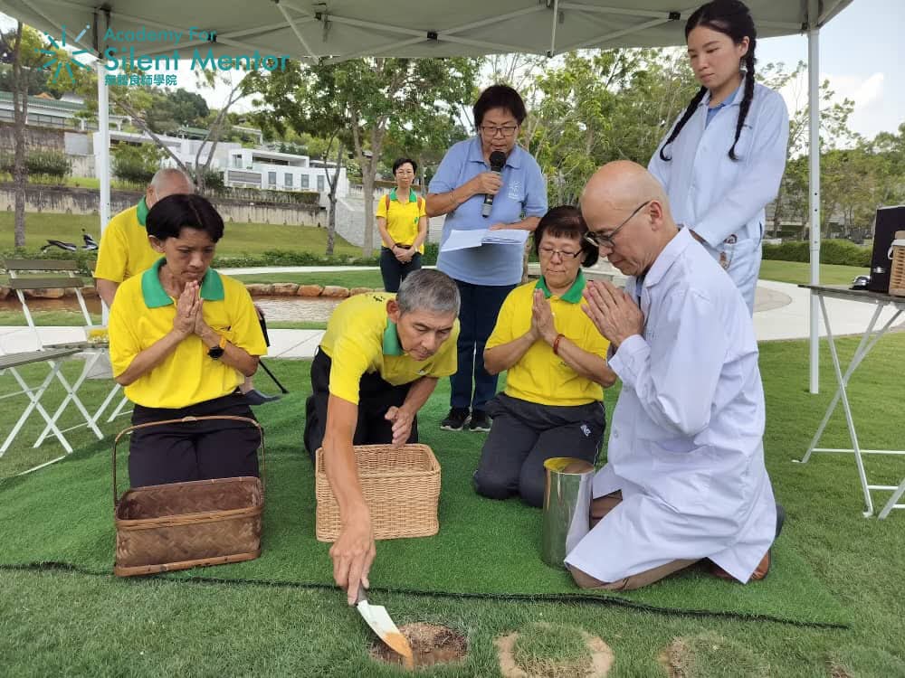 “净愿慈怀之家”院长杨宝美与“无语良师学院”创办人陈庆华教授将经过火化后的杨桂英骨灰,在专区内植入土坑里,随后覆盖上草皮即圆满。