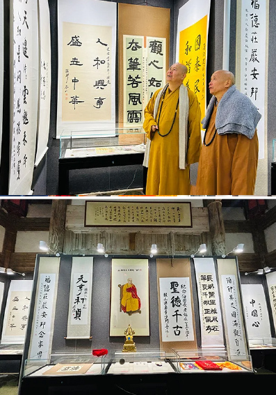 我们一群人一边走一边打卡拍照,经过千年松柏,聪明泉,千年观音殿,大雄宝殿,终于来到“纪念伯圆长老诞辰110周年书画展”。