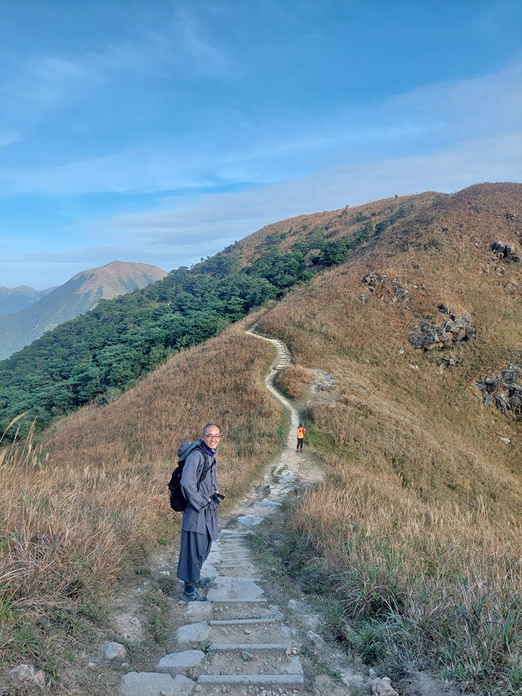他每次行山都会想起老子所讲的“千里之行,始于足下”,因此迈出眼前这一步最重要。我们修学正念也如此,因心如猿猴到处蹦窜,因此学习守住当前这一念很重要。他尽量学习“人到心到”的生活态度。
