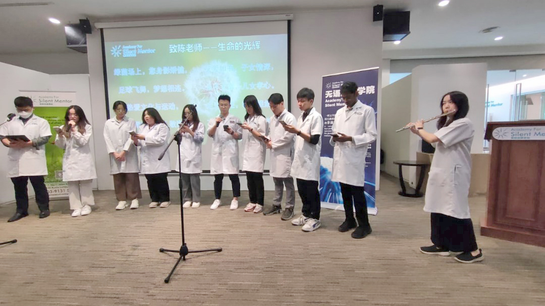 无语良师医学一众学生朗诵诗歌献给陈炳南老师,并有笛子配乐。