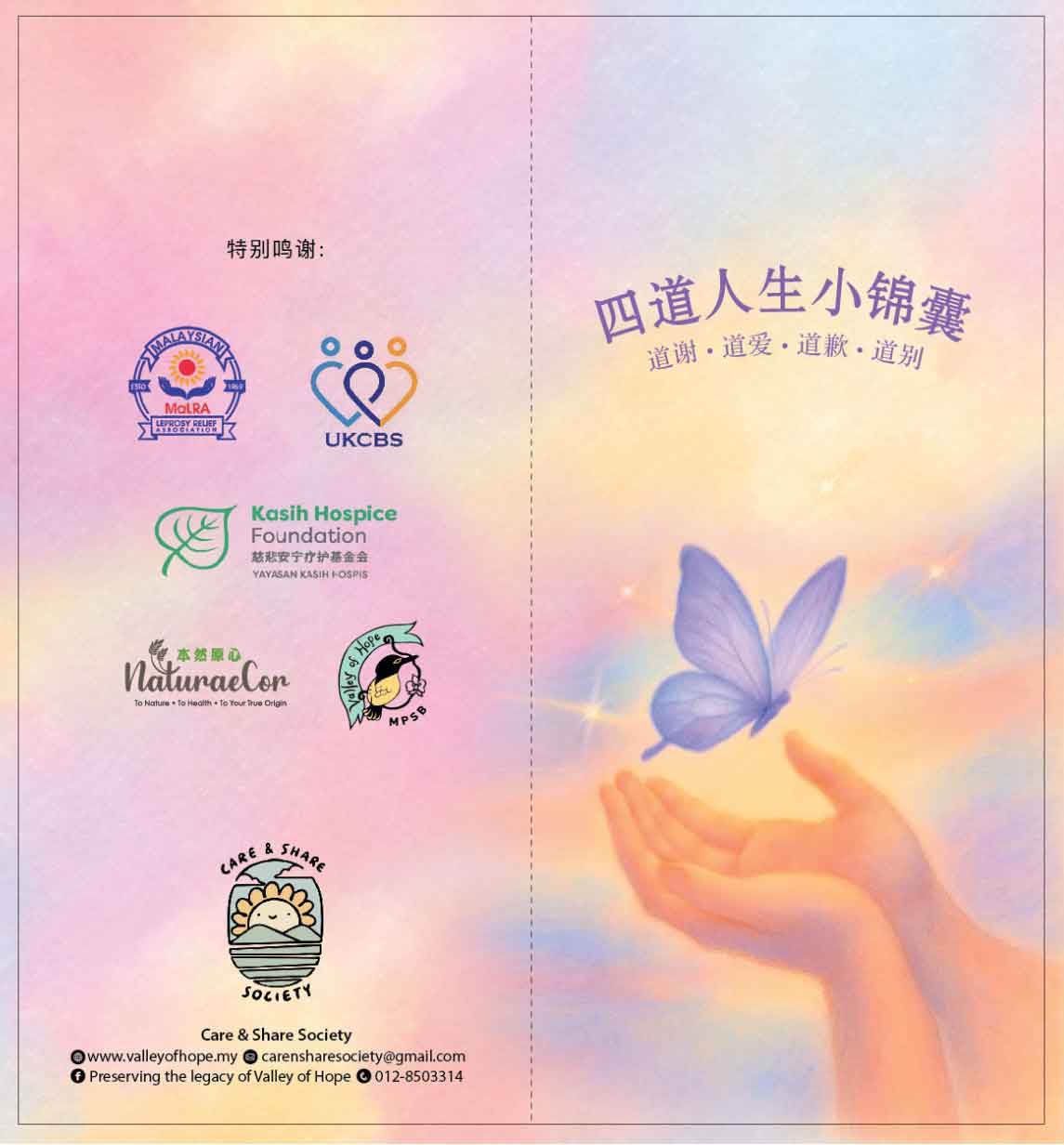 为纪念希望之谷(双溪毛糯麻疯病院)成立95周年,常年在希望之谷服务的非政府组织Care & Share Society发起了《四道人生》计划,倡导四个人生智慧:道谢、道爱、道歉、道别。
