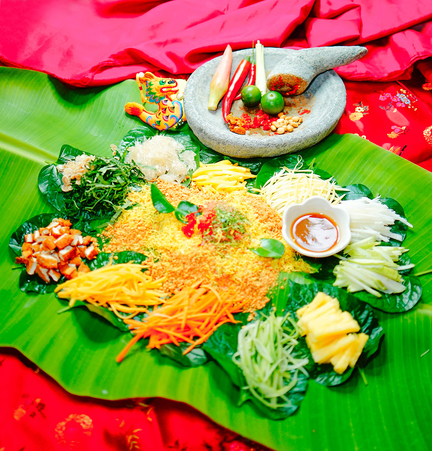 4. Prepare a big serving plate/tray with banana leaf arrange all shredded ingredients and fried bean curds on serving dish, add in 1/2 bowl of toasted coconut, roasted ground peanuts and crispy chips on center of plate.