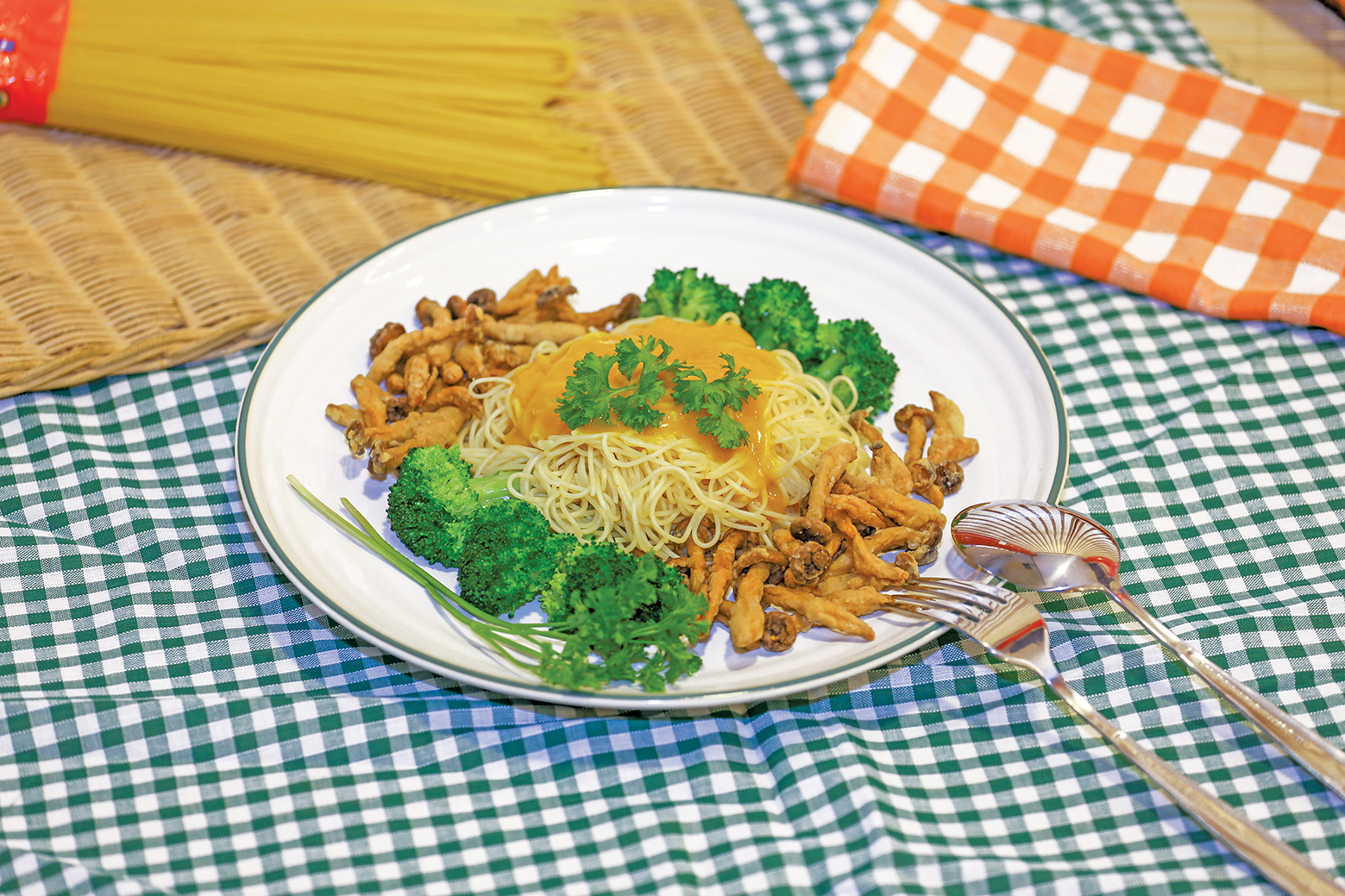 5)将金瓜酱淋在面条上,再加入芥兰花和炸好的柳松菇摆设在餐盘即成。
