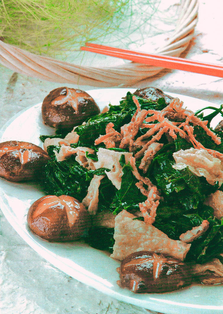 3. 烧热1大匙油爆香薑丝,加入鲜菇和蚝油,快手兜炒起镬拌入树仔菜边卽成。