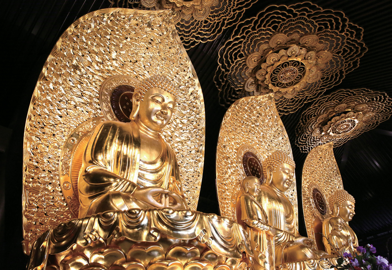 一踏入寺院内,大雄宝殿占地约1,027平方米,最高18米;大雄宝殿三尊大佛的莲花状宝盖,镀上24K金,还有佛祖释迦牟尼像和十八罗汉,亦陈列了饶宗颐教授所书《心经》的墨宝。