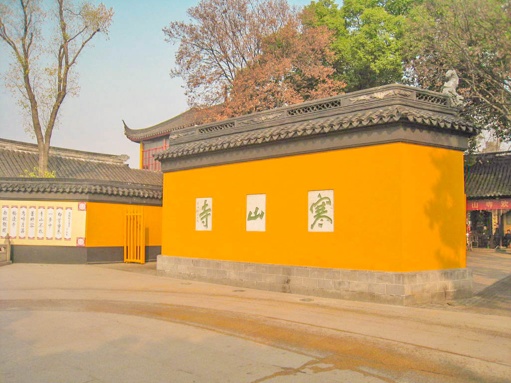 因为张继的诗,寒山寺里外都是慕名前来的游人;因为张继的诗,寒山寺山门外那其实很一般的土黄色围墙,总是不断地被摄入镜头。髹成乐土黄色的寒山寺围墙,这似乎是中国很多佛寺的统一色调——稍后在杭州造访江南第一名刹灵隐寺,乃至许多在大城小镇的大路边或水巷里,那些有意无意间移入我们视线的寺庙,都是这么一堵土黄色调。寒山寺的围墙之所以受到特别的青睐,原因无他,就因为它是名闻遐迩的寒山寺——三个出自名家笔墨的大字书写,把那原本无异于一般的土黄墙面给突显而出,从而跟千古诗韵连成一气了:来,到那里站好,对,就是这角度,笑一个,说“茄子”吧!好啦,“卡嚓”,唔……行啦,导游比了个OK手势示意说。寒山寺,似乎就这样地让跋涉而来的游人给装在行囊里带走了!