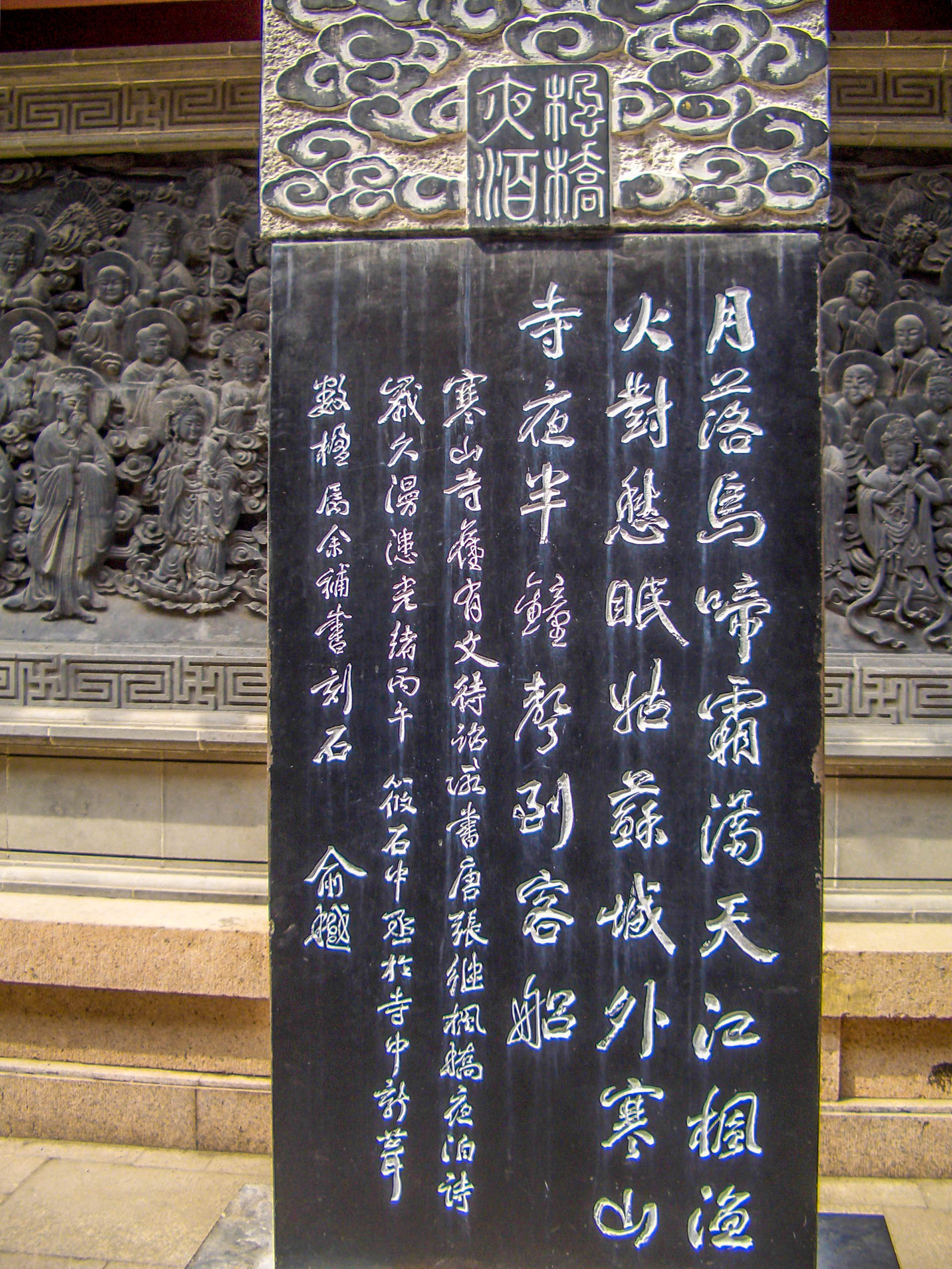 因为张继的诗,寒山寺里外都是慕名前来的游人;因为张继的诗,寒山寺山门外那其实很一般的土黄色围墙,总是不断地被摄入镜头。寒山寺的围墙之所以受到特别的青睐,原因无他,就因为它是名闻遐迩的寒山寺——三个出自名家笔墨的大字书写,把那原本无异于一般的土黄墙面给突显而出,从而跟千古诗韵连成一气了。