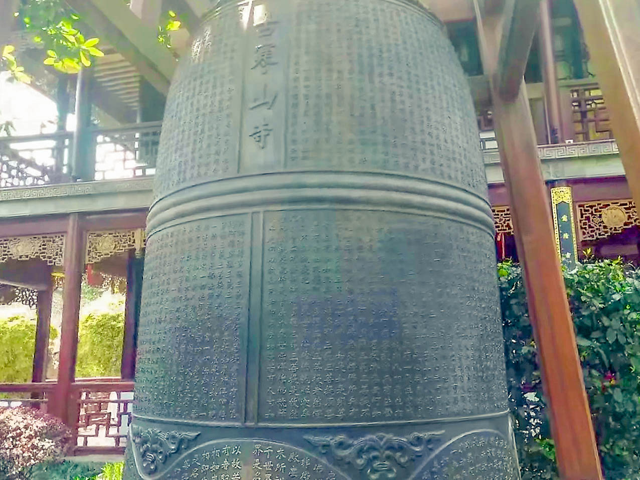 姑苏城外寒山寺,喔,说起来呵,其实就不过是那窜出了墙头再随风远扬的隐约钟声,当年它不经意地触动了诗人的旅夜愁怀,于是便给载录到诗句里,而把余响给延续到了今天。倘若不是这样,那么,想来寒山寺也不过是一座历时跨代地相承的一般江南古寺而已了。然而,张继当年毕竟闻得了钟声,而且写下了传颂千古的名诗,于是乎,寒山古寺的钟声也就藉之流传千古, 寒山寺之名也千古不朽了。于是乎,来到了苏州,我们别的佛寺都不去,只是藉着唐人诗句回响不止的古钟余韵,找到了它千年源头的寒山寺,也找到了寒山寺的钟楼底下。
