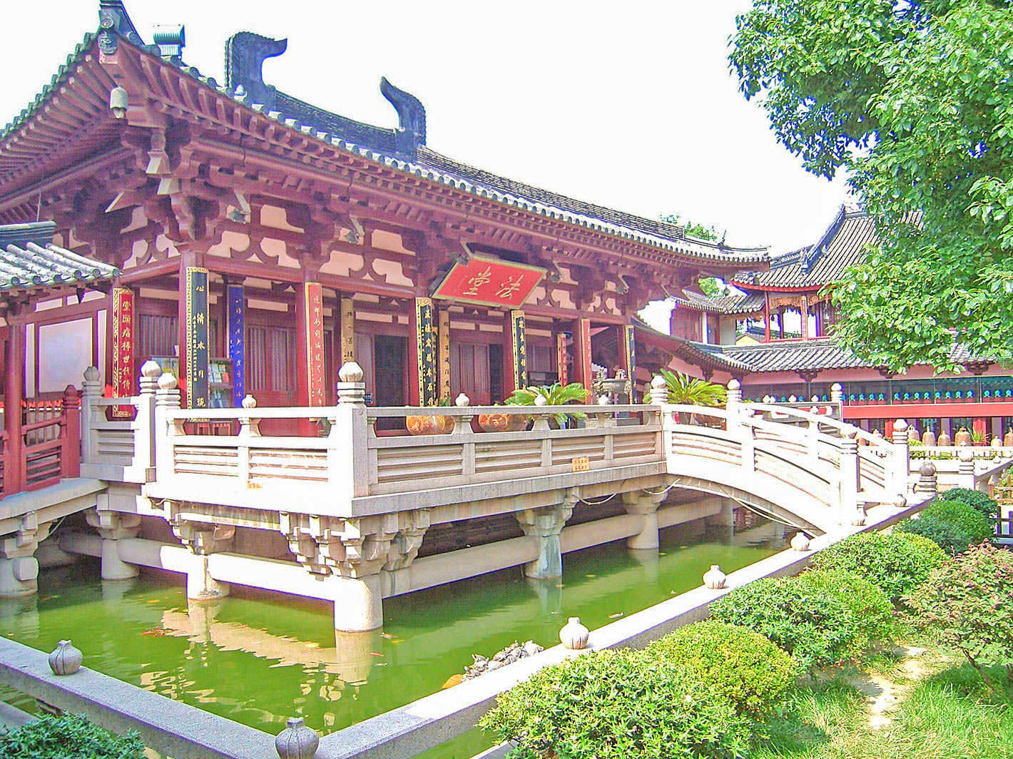 来到了姑苏城外,其实我们只见寒山寺而不见枫桥。寒山寺门墙外也有一座单拱的石桥,却不是赫赫有名的枫桥——单只取的枫桥这名字,就已充满古典诗意的了。即使说枫桥原来是叫封桥——因每到夜晚时分就封锁水道不让船只通行而得名,但在张继的绝句完成并传扬开来之后,封桥乃易以枫名,线上装的诗集里,它早已给凝定下来了。没跟寒山寺贴靠得那么近,枫桥还要远了些,于是才能让钟声隐隐约约地遥传而去,于是才让张继在旅夜里闻得了得以入诗的钟声。诗人旅夜闻钟的枫桥,今天却没给规划在寒山寺景区,而我们也没有沿着河道上溯诗源,去寻访那拱身在古诗里的枫桥:即使找去了又如何?那样的夜泊枫桥,那样的旅夜闻钟,而今已没有人可以重演其情境了!