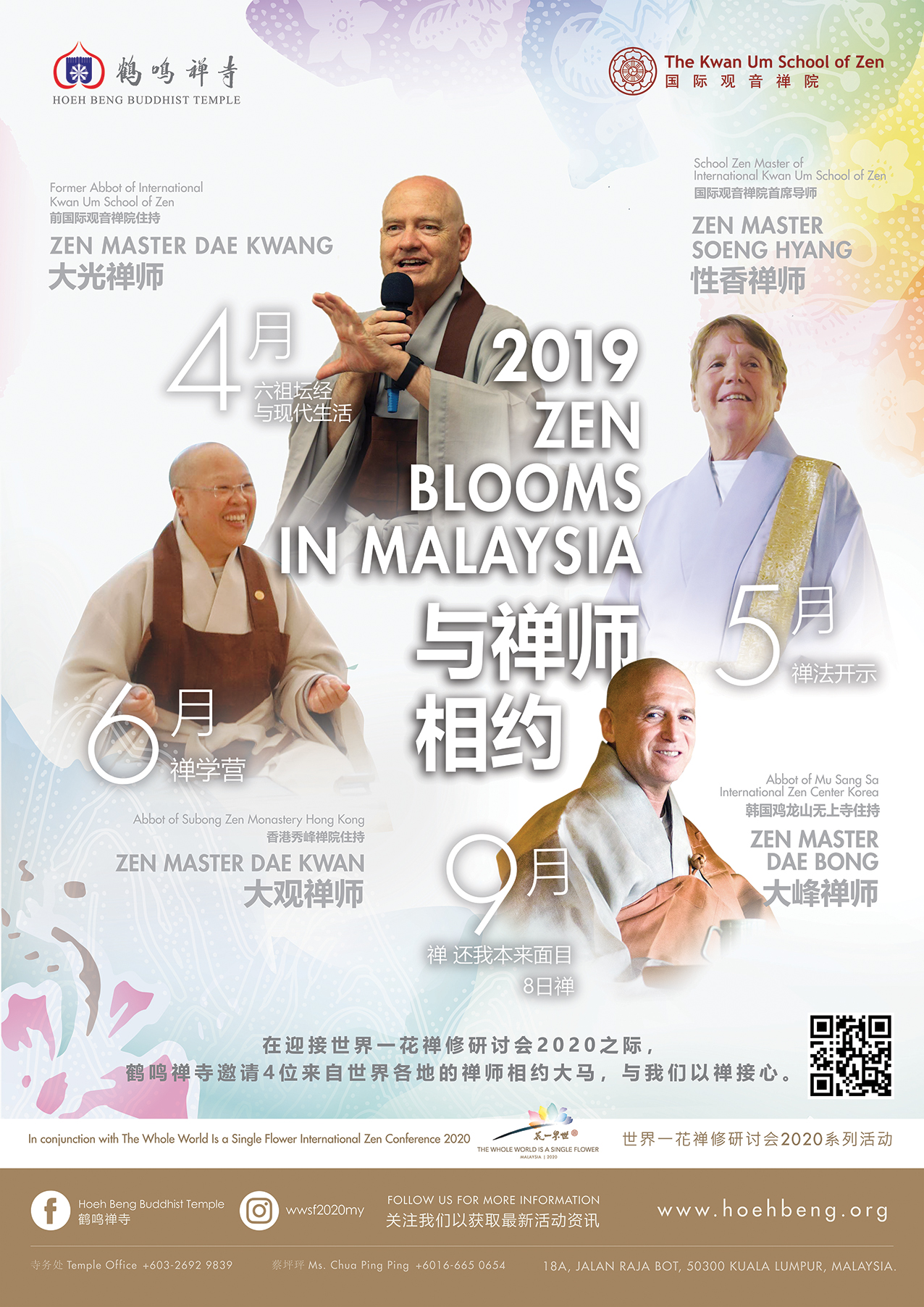为了配合《2020世界一花》禅修研讨会,今年共有四位禅师到鹤鸣禅寺与大家相约的系列活动,四月份是来自新加坡美国藉的大光禅师,主讲“六祖坛经与现代人的生活”。五月份是性香禅师来自美国,主讲“观世音反闻闻自性”。六月份是来自香港的大观禅师主持二日“打开ABCDE禅门FUN”禅学坊。九月份将会由来自韩国美国藉的大峰禅师,主持《还我本来面目》八日禅。