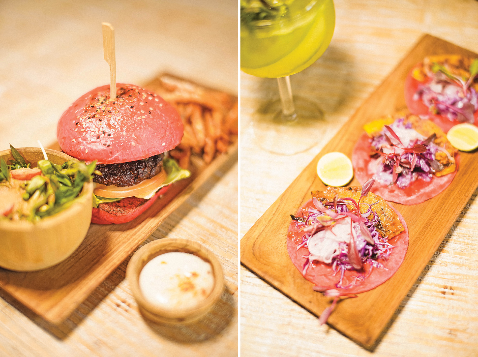 最让人惊艳, 最具人气的其中一个必点美食是The Pink Bombshell (粉红炸弹)。它是用甜菜根自然色素制成的全素汉堡。 超大的汉堡面包是粉红色的, 夹着用菇类和蔬菜调制的粉红色馅饼, 加上番茄、 生菜、洋葱, 和以酥油制成的全素乳酪, 大大的一个, 可供两人分享。配上健康美味的蕃薯条, 沾着低卡的特制蒜香酱料, 实在是满口滋味, 满心的幸福。