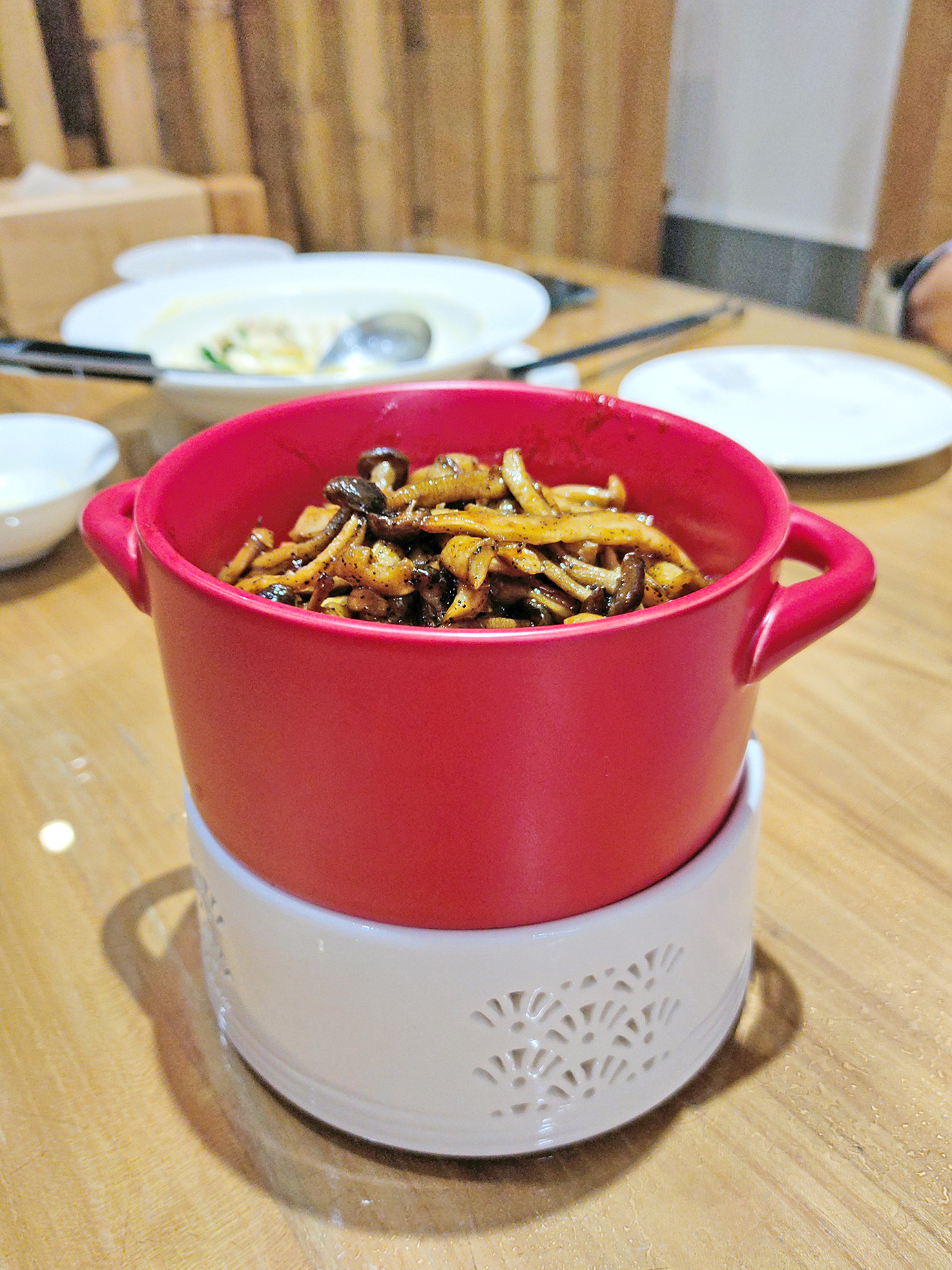 红的让人热情奔放的碗具装载着满满的茶树菇。别错以为它只是普通单调的一道素食菜肴,它是用黑松露酱拌炒出来的珍品。