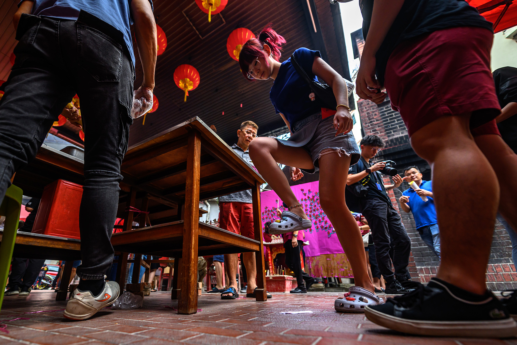 为了亲睹古人是如何进行现代潮语的“拉黑”操作,我到隆市最老旧的庙观逛一转,左脚才踏入门槛,右足已陷入一个犹如贩卖各种玄怪民俗的市集里。边门一隅有撮人手持炷香猛“笃”掌心上的公仔图,直到满纸的造谣是非都被薰炙成一缕青烟随之灰飞。往里墙继续探奇,又见三两人不时蹬脚踮尖,伸长手往一幅像似开满桃红纸花的壁板拍贴,镜头推进才对焦那是一个个圆嘟嘟、脸绘金眼口鼻的小红人骑在绿马上,光照间“贵人禄马”欲乘风而去。终于来到主戏,法坛正中一线排开,桌上鸡蛋肥油喂祭白虎利牙,法师手握一叠符纸在信徒胸背交错拂拭,对企图附身的厄运下逐客令后,突然将一白色纸人扔下地,吆喝道:“踩它!”信众的脚板如震雷击落,难怪百虫惊走,踹踏之后满面春风,捡起那奄奄一息的纸符,抛入化宝炉焚灭,相信从此好运纷至鬼神退散。