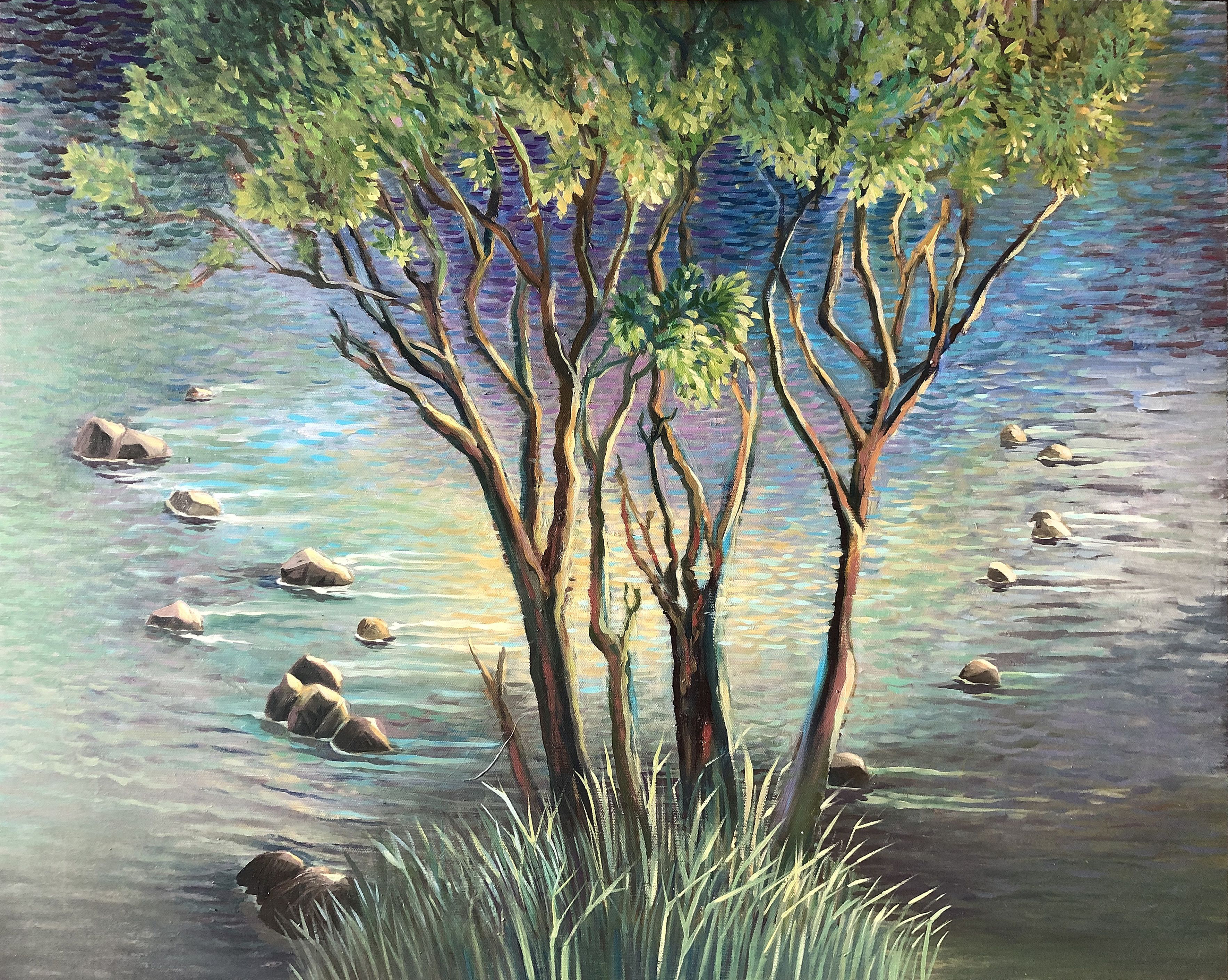 这幅画作,题为《曼珠沙华》系列三,画的是一处维度与维度之间的界线。在大存有之中,数不尽的不同维度,其交错之奥秘非我们这一回的体验所能理解。但它们是存在的,我们必须明白有着这样的宽阔,能够理解这个宽阔,那么我们的意识才能去到宽阔。